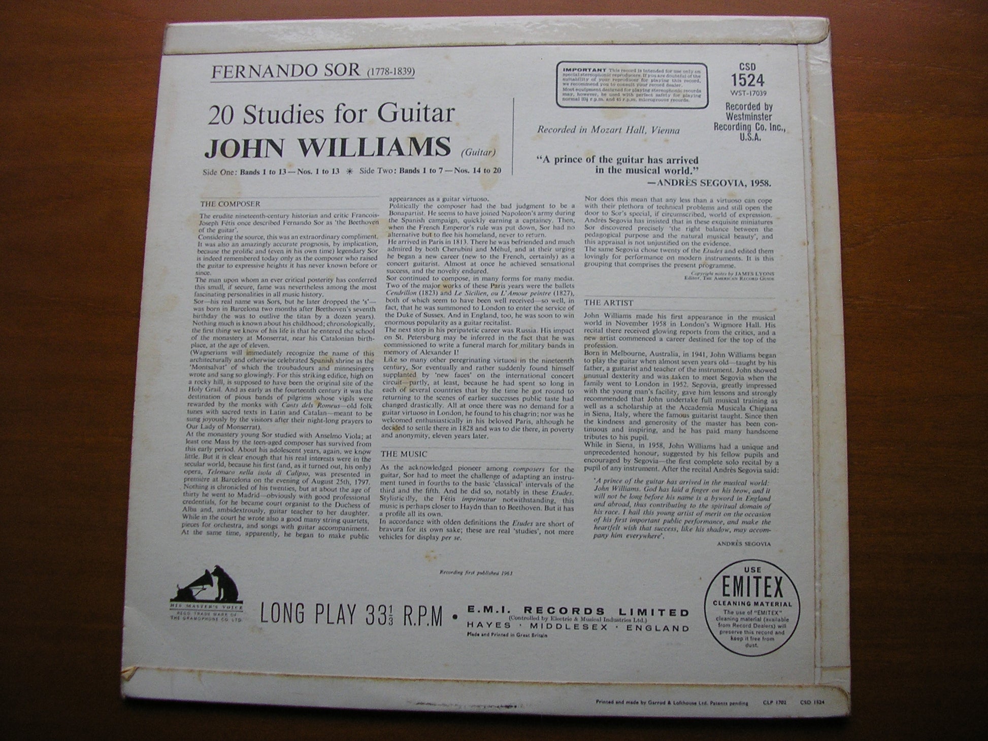 CSD 1524  FERNANDO SOR: 20 STUDIES FOR GUITAR     JOHN WILLIAMS
