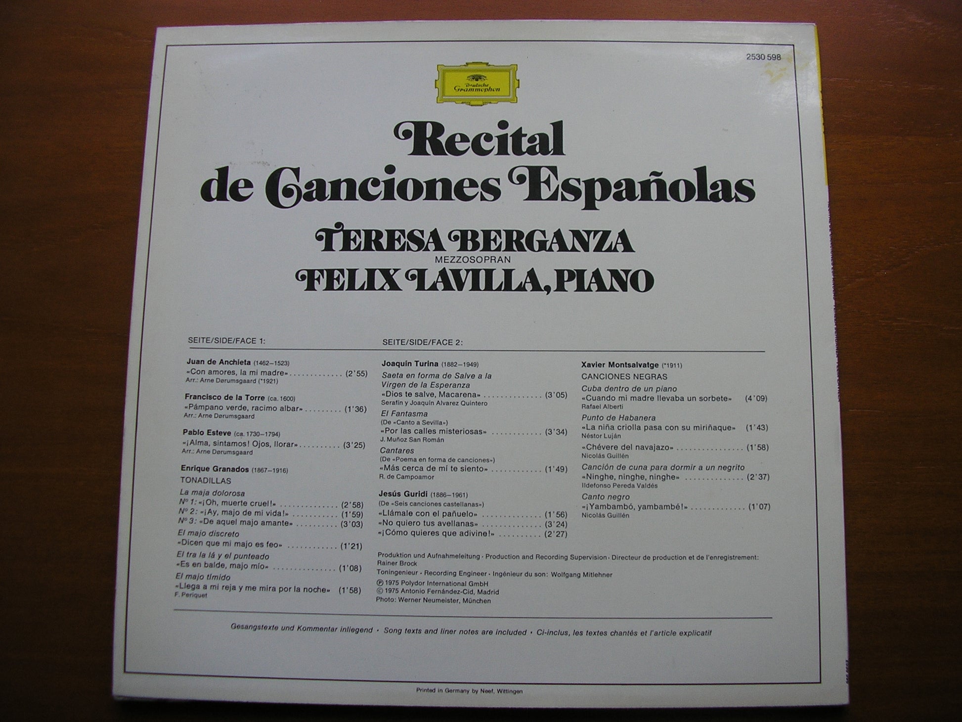 2530 598  SPANISH SONGS: DE ANCHIETA / DE LA TORRE / ESTEVE / GRANADOS / TURINA / MONTSALVAGE / GURIDI        TERESA BERGANZA / FELIX LAVILLA