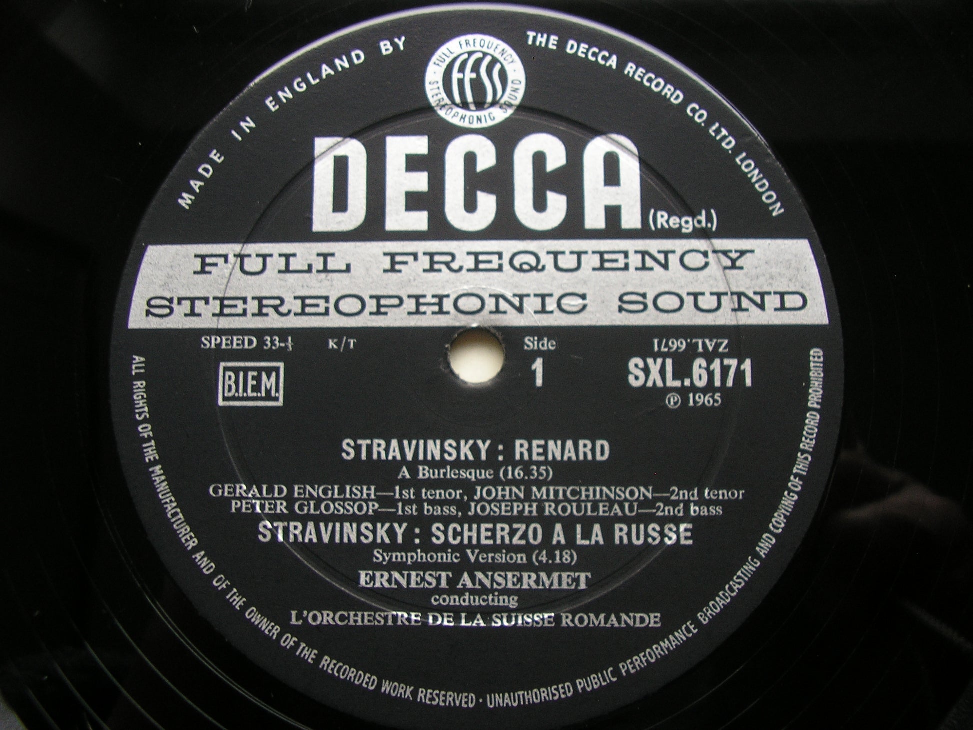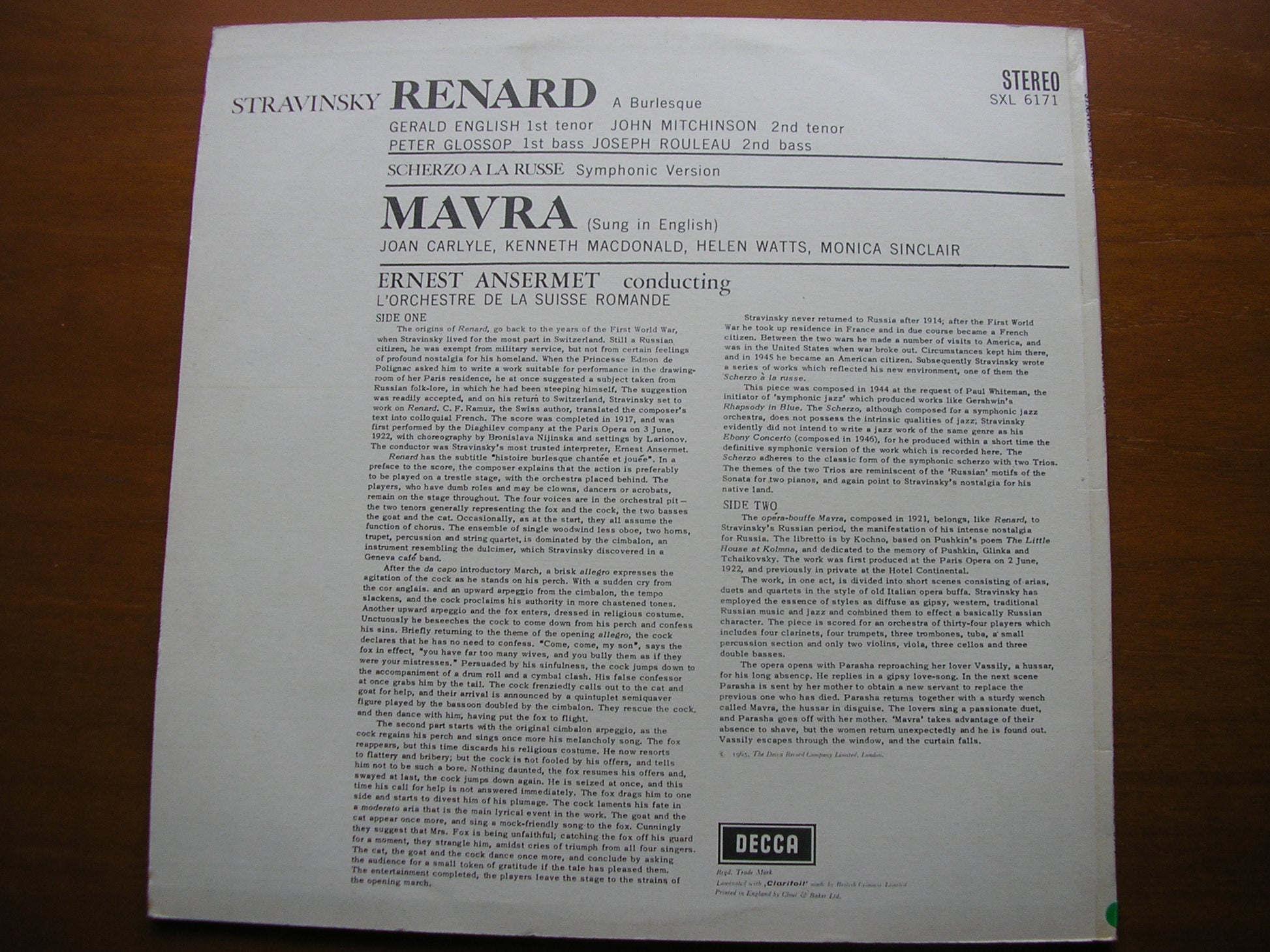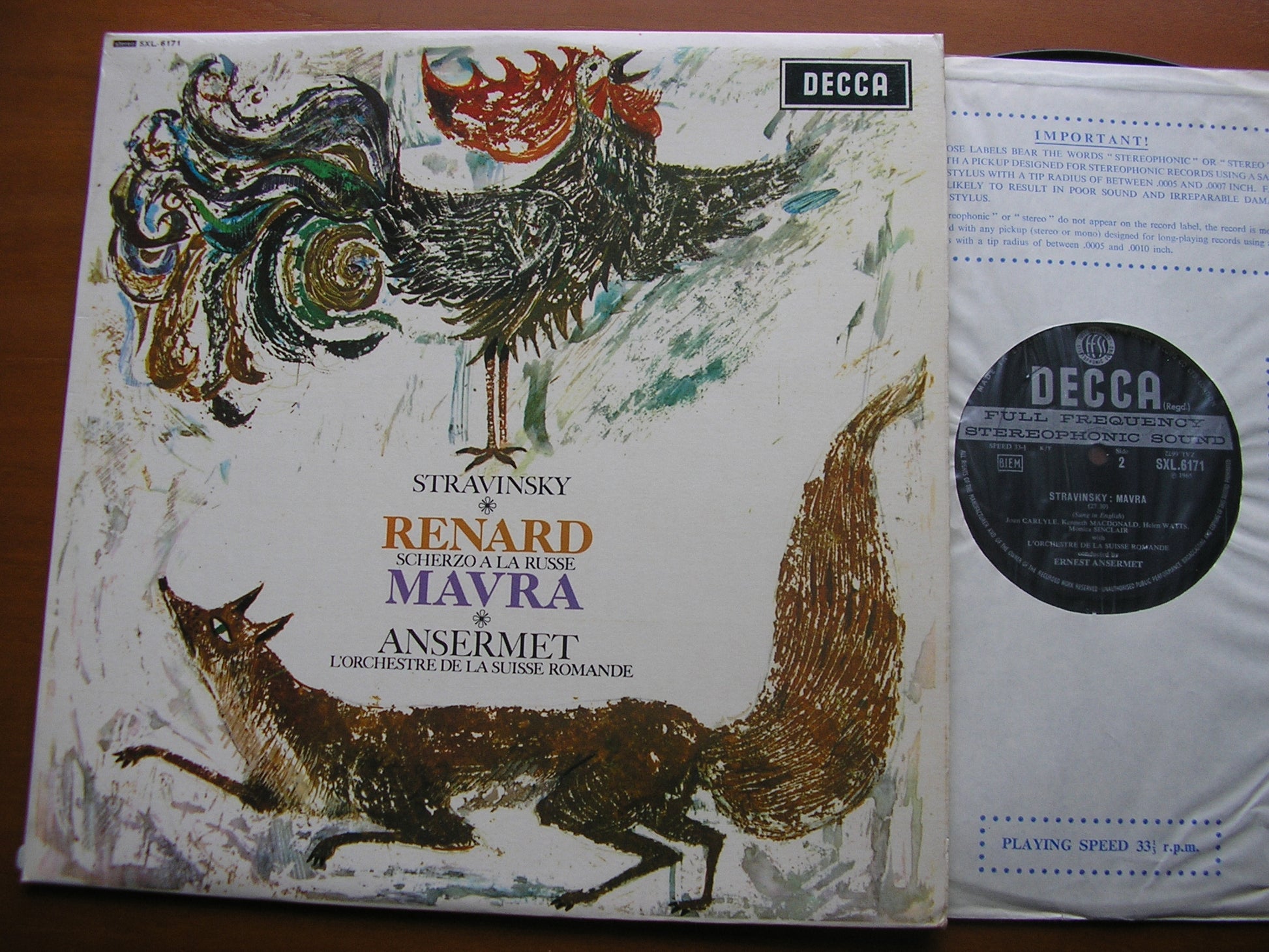 SXL 6171  STRAVINSKY: RENARD / MAVRA / SCHERZO A LA RUSSE    SOLOISTS / ERNEST ANSERMET / SUISSE ROMANDE ORCHESTRA