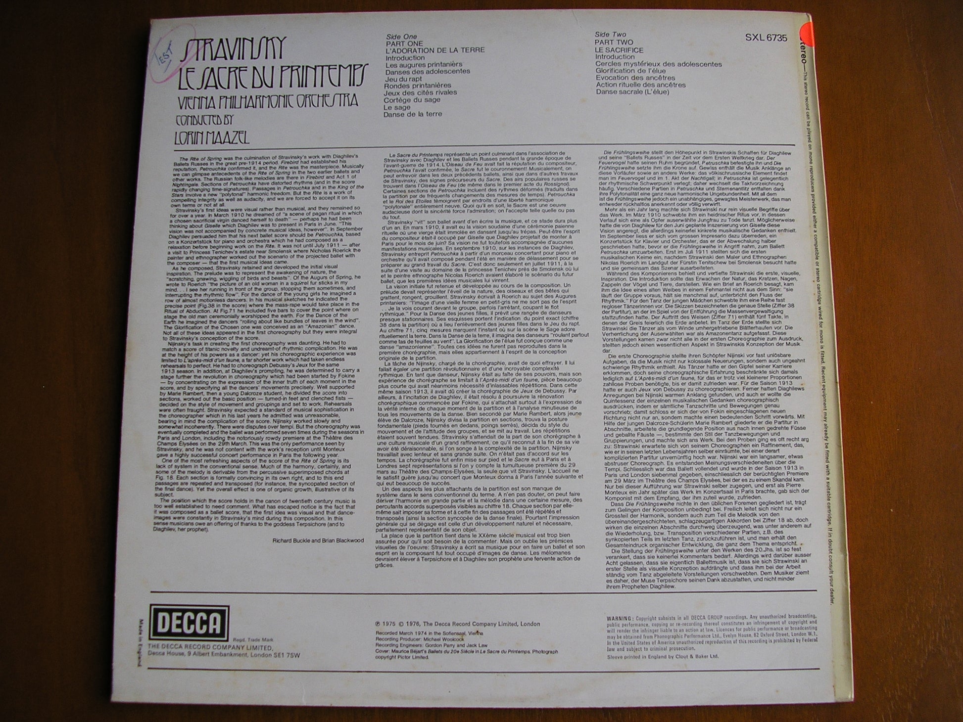 STRAVINSKY: THE RITE OF SPRING MAAZEL / VIENNA PHILHARMONIC test pressing SXL 6735