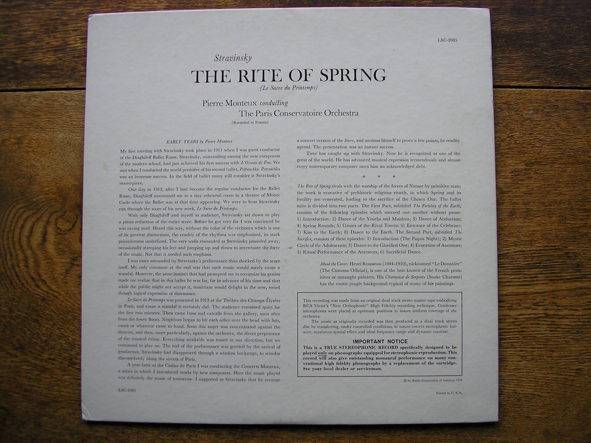 STRAVINSKY: THE RITE OF SPRING MONTEUX / PARIS CONSERVATOIRE LSC 2085