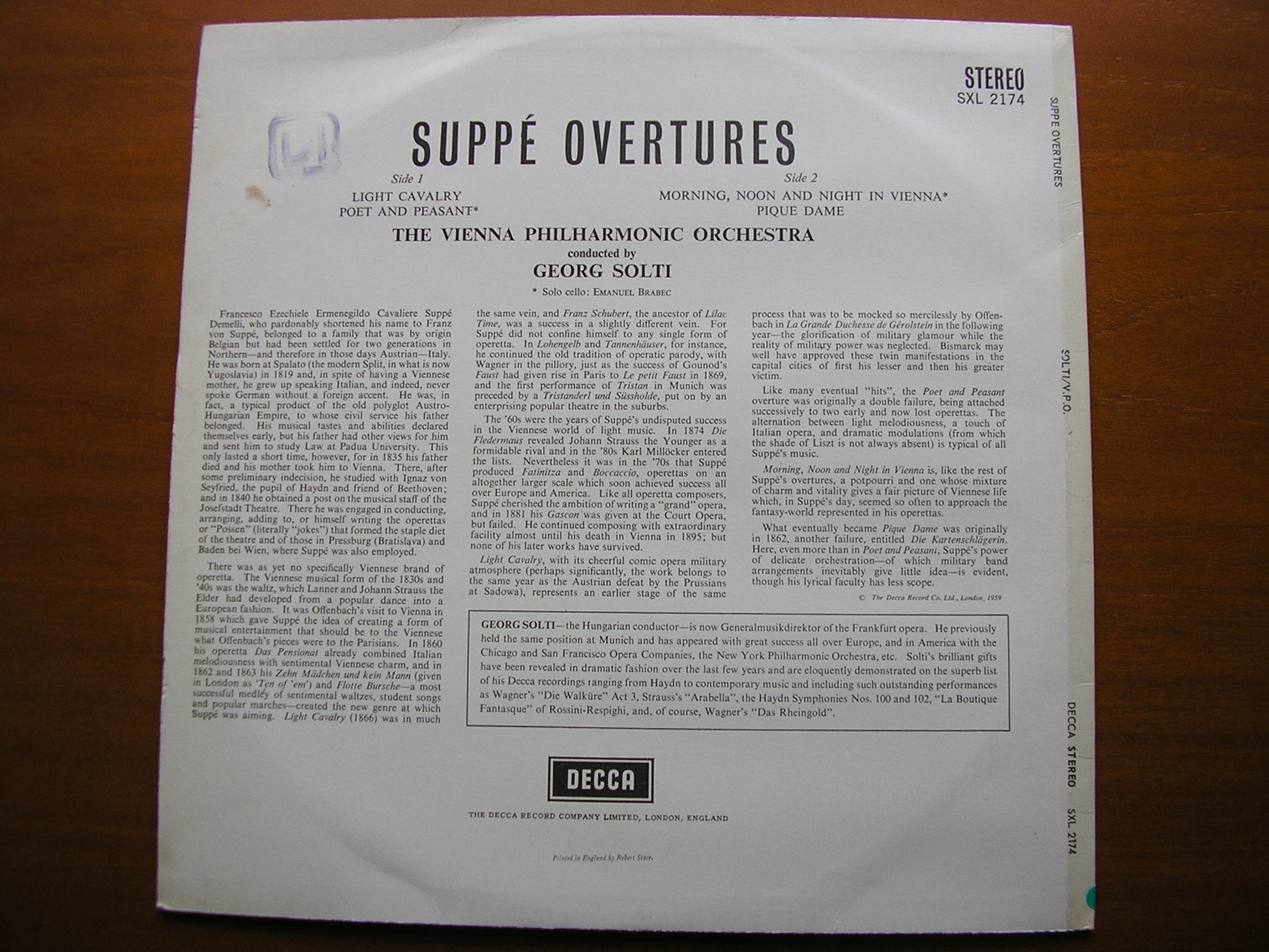 SXL 2174  SUPPE: FOUR OVERTURES     GEORG SOLTI / VIENNA PHILHARMONIC ORCHESTRA