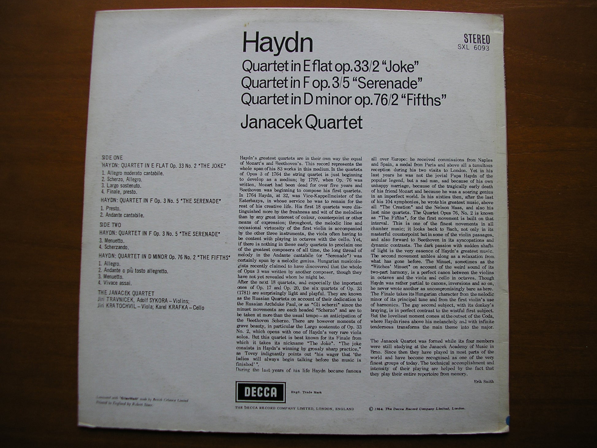 SXL 6093 STRING QUARTETS in E 'Joke' / in F 'Serenade' / in D 'Fifths'    JANACEK QUARTET