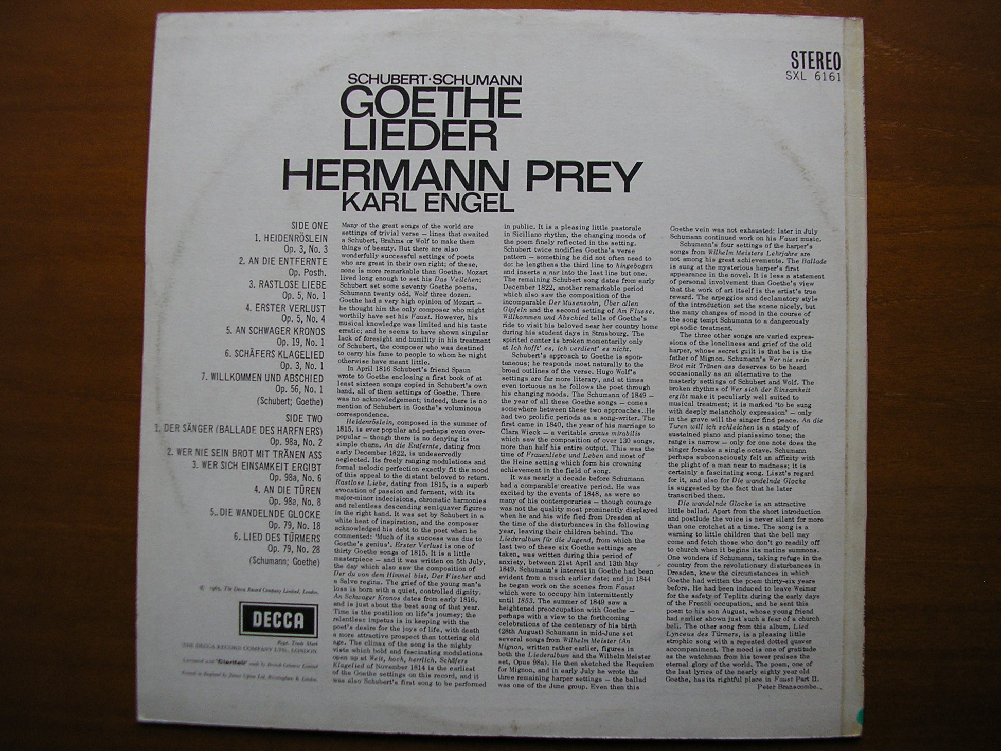 SXL 6161 GOETHE LIEDER: SCHUBERT / SCHUMANN HERMANN PREY / KARL ENGEL ED2