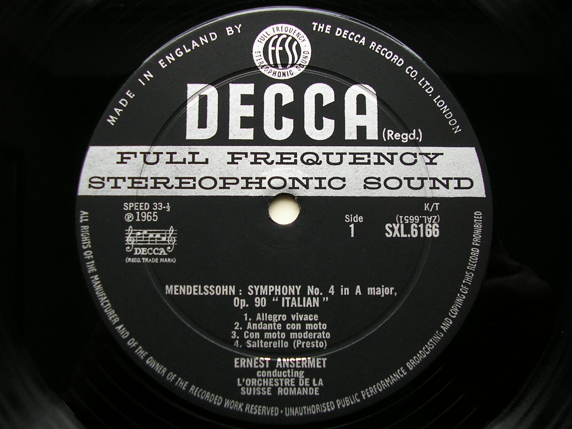 SXL 6166 MENDESSOHN: SYMPHONY No. 4 'Italian' / THREE OVERTURES ANSERMET / SUISSE ROMANDE ED2