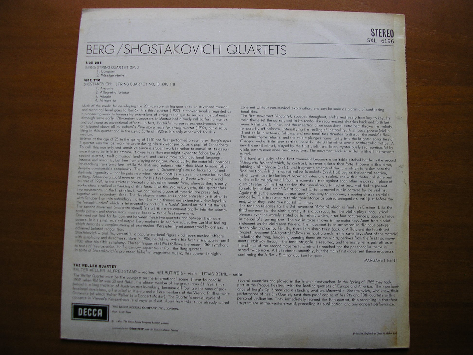 SXL 6196 SHOSTAKOVICH: STRING QUARTET No. 10 / BERG: QUARTET Op. 3 THE WELLER QUARTET ED2
