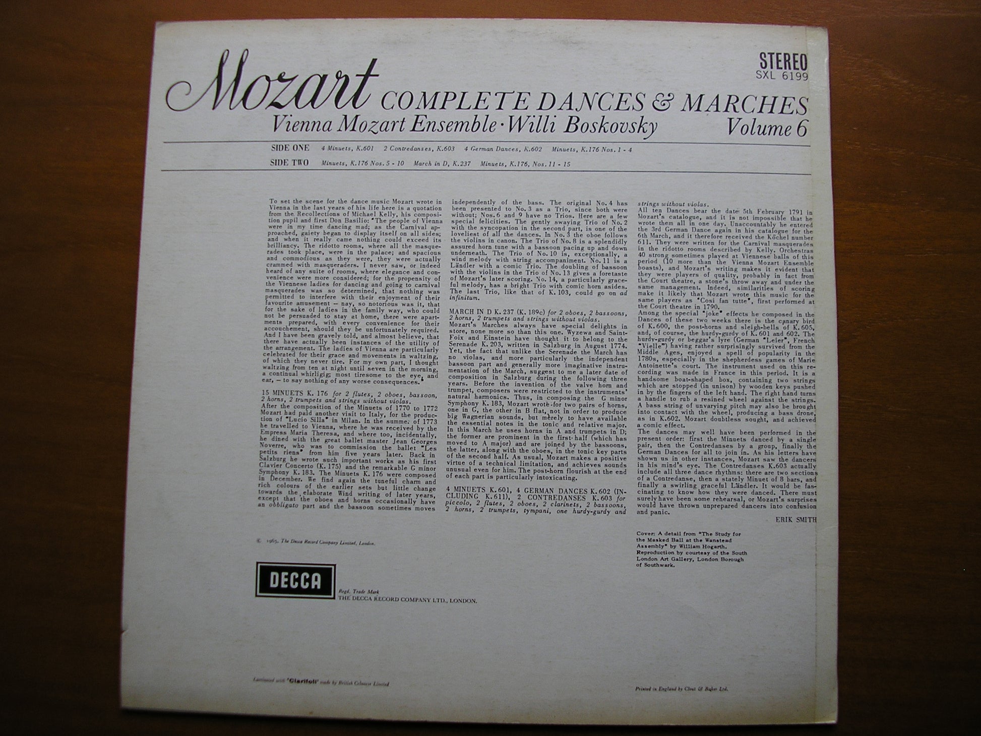 SXL 6199 MOZART: COMPLETE DANCES & MARCHES  Volume 6    WILLI BOSKOVSKY / VIENNA MOZART ENSEMBLE