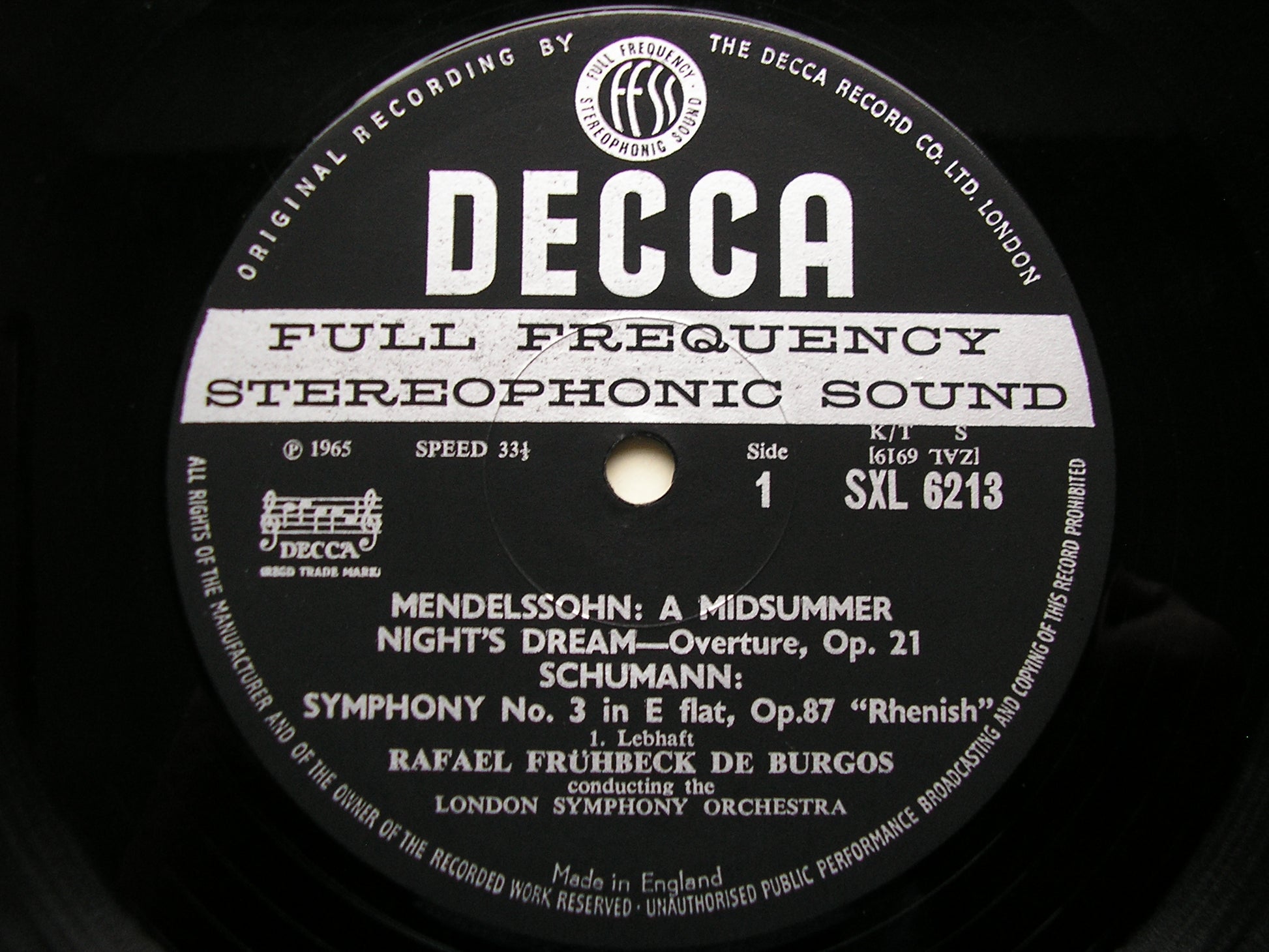 SXL 6213 SCHUMANN: SYMPHONY No. 3 / MENDELSSOHN: OVERTURE 'A Midsummer Night;s Dream'      RAFAEL FRUHBECK DE BURGOS / LONDON SYMPHONY ORCHESTRA