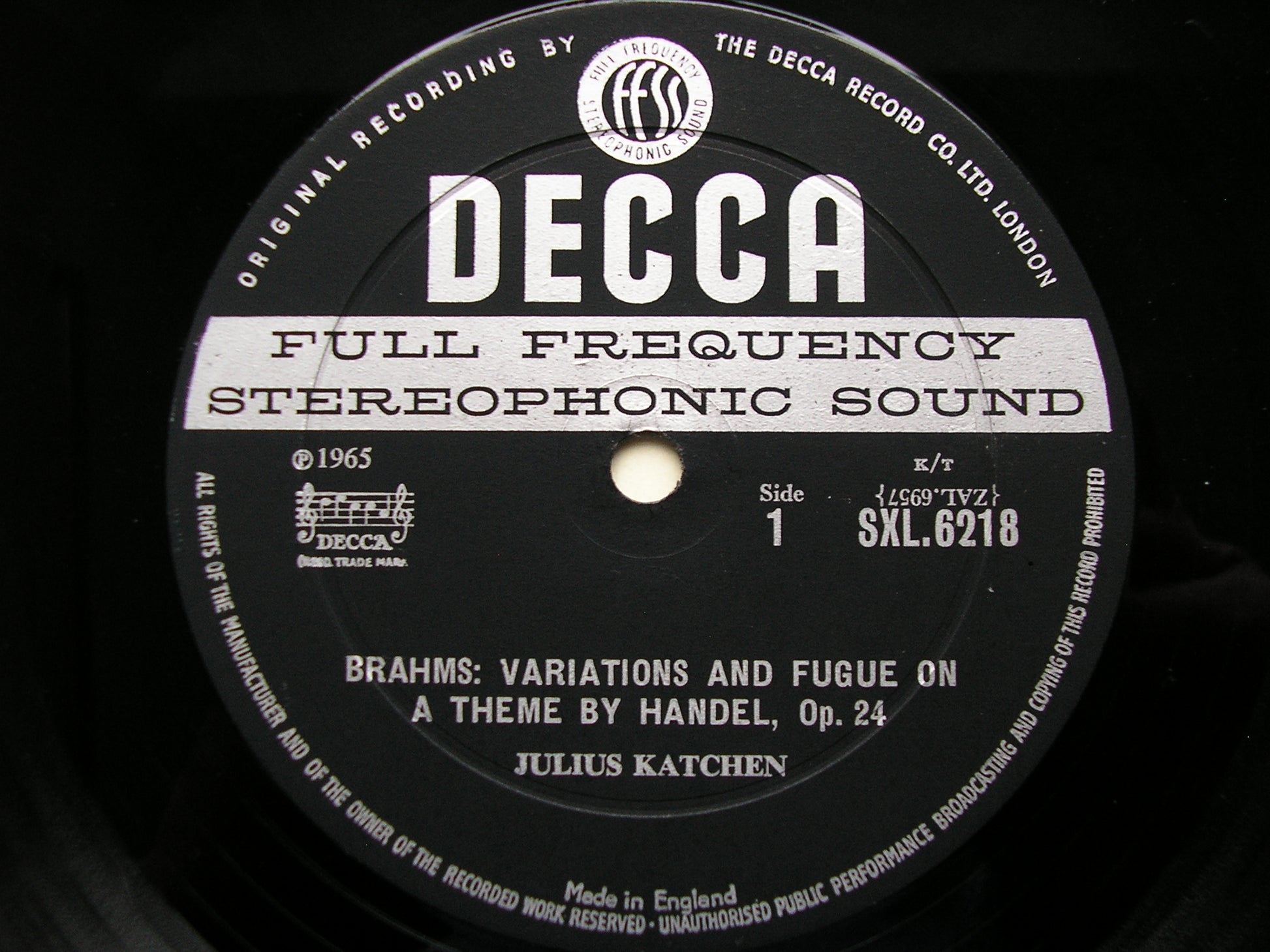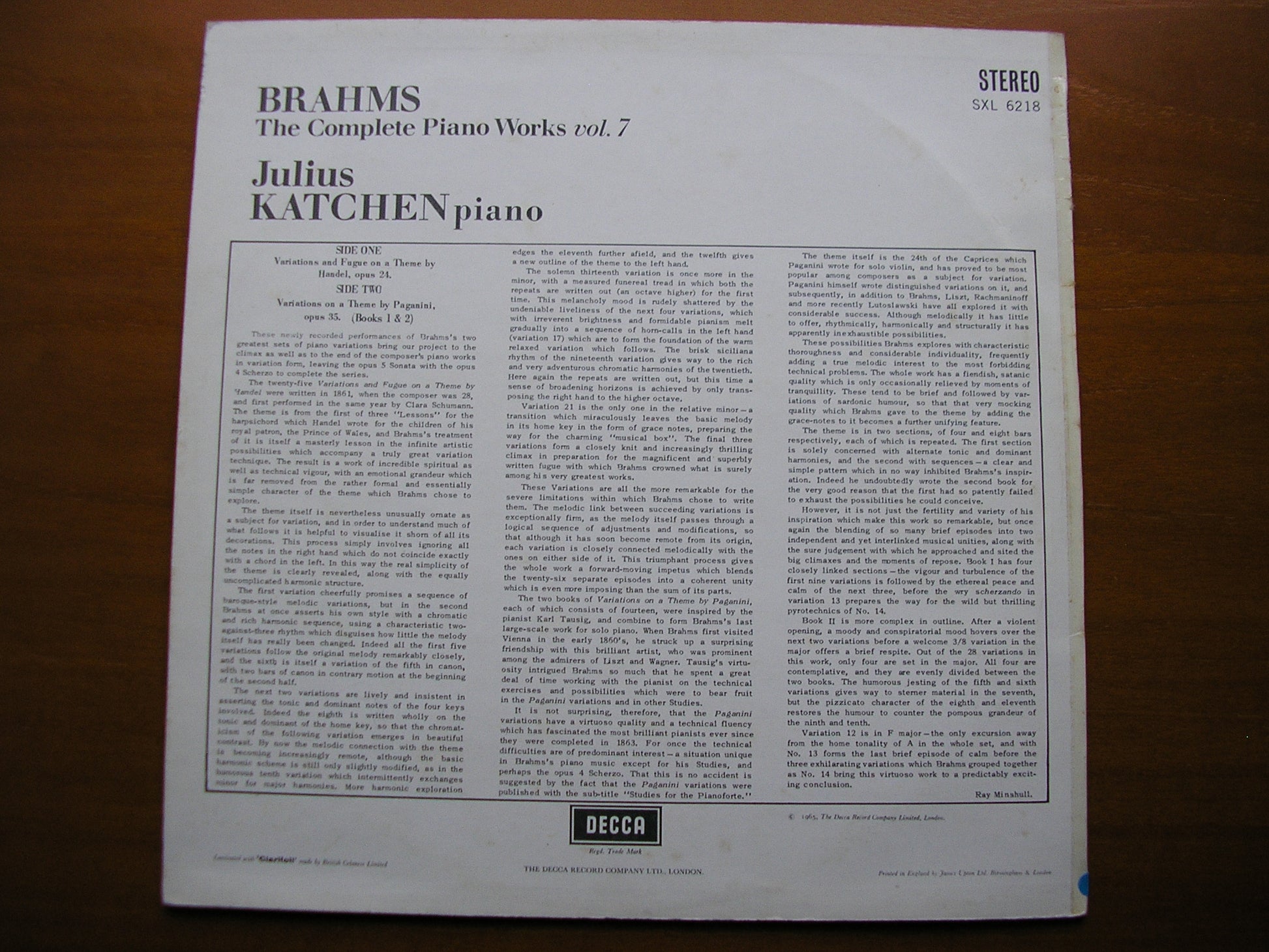 SXL 6218 BRAHMS:  HANDEL VARIATIONS / PAGANINI VARIATIONS     JULIUS KATCHEN