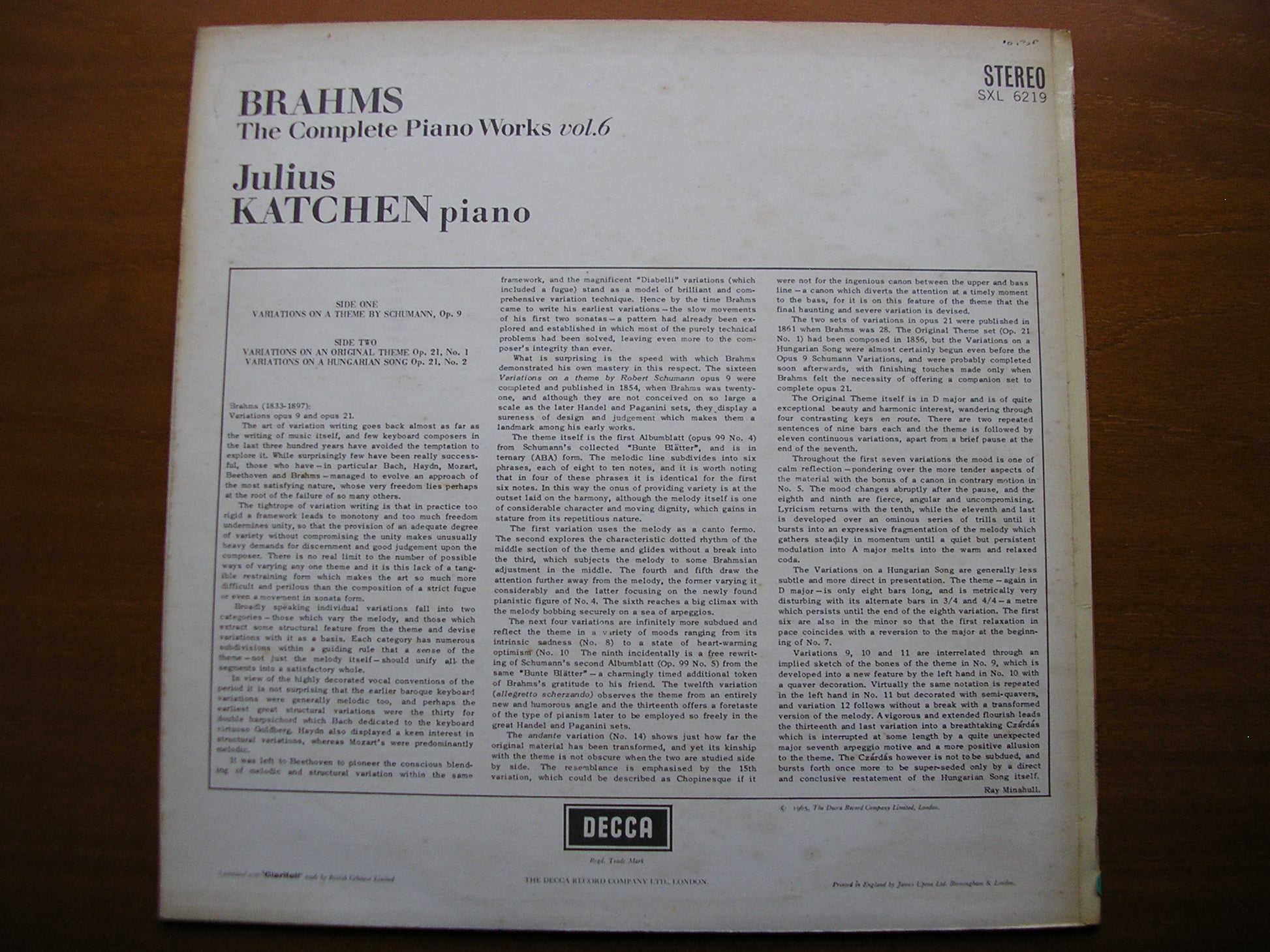 SXL 6219 BRAHMS: COMPLETE PIANO WORKS Volume 6 JULIUS KATCHEN ED2