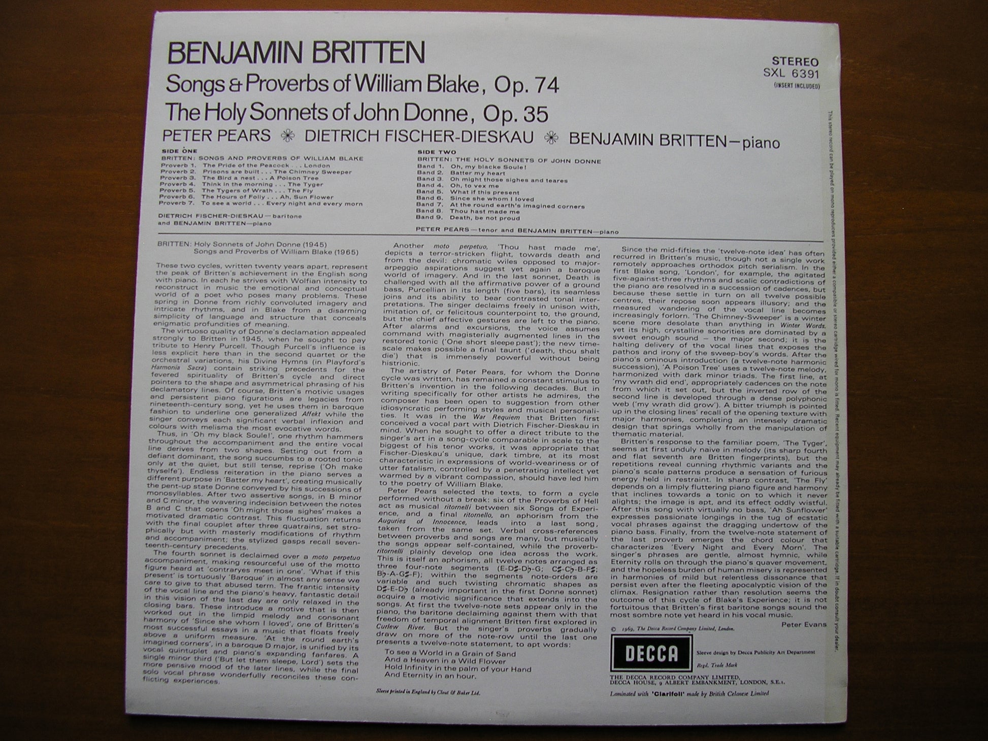 SXL 6391 BRITTEN: SONGS ON TEXTS BY WILLIAM BLAKE & JOHN DONNE FISCHER-DIESKAU / PEARS / BRITTEN ED3