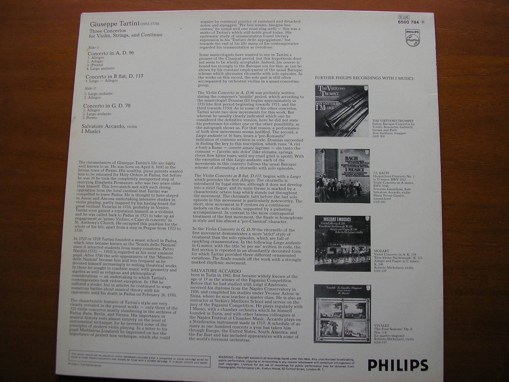 6500 784  TARTINI: THREE VIOLIN CONCERTOS    SALVATORE ACCARDO / I MUSICI