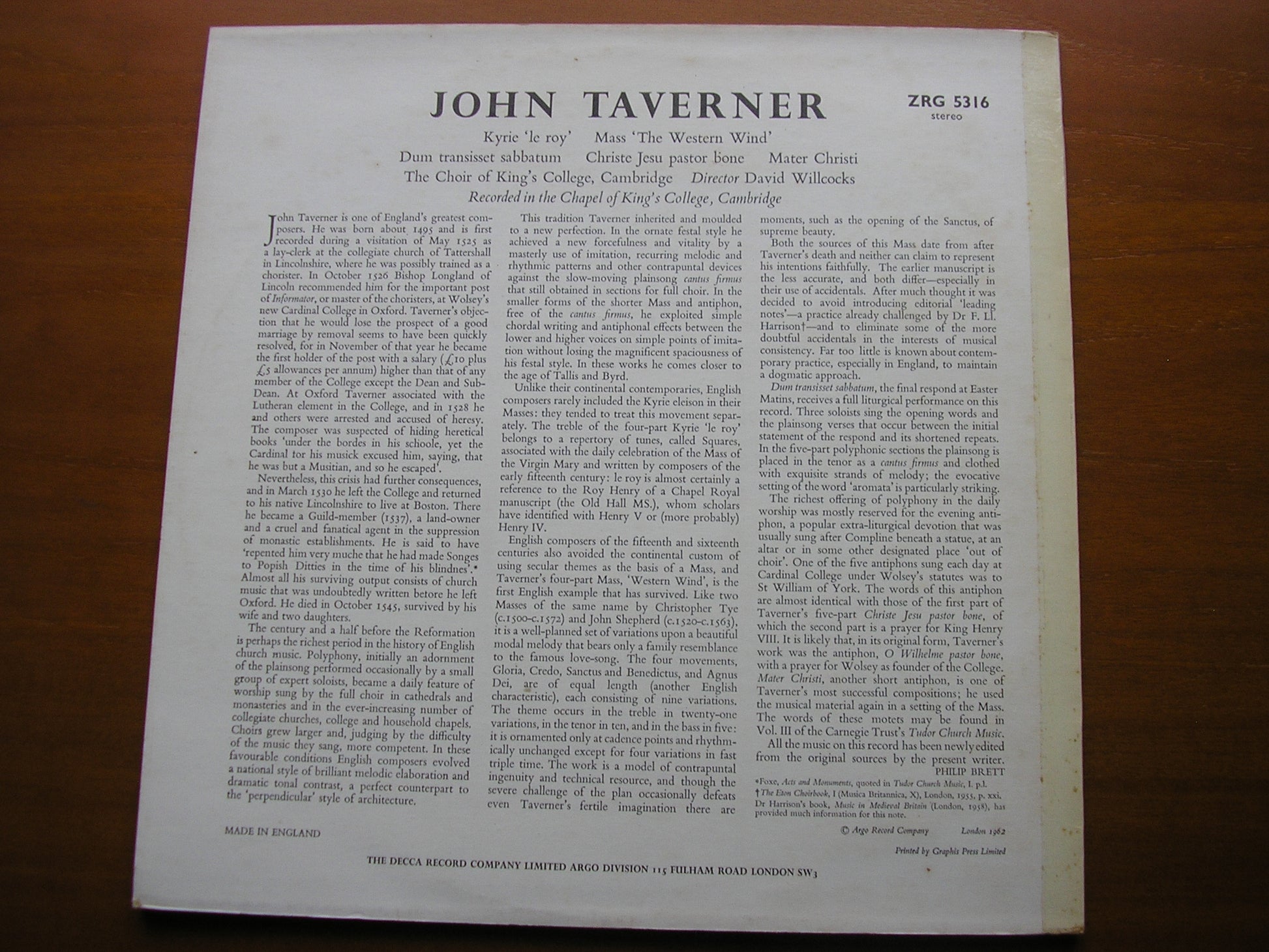ZRG 5316  TAVERNER: MASS 'The Western Wind' / KYRIE    KING'S COLLEGE CHOIR / DAVID WILLCOCKS