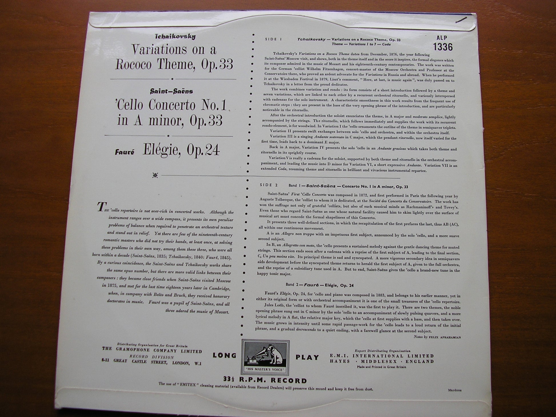 ALP 1336  TCHAIKOVSKY: ROCOCO VARIATIONS / SAINT-SAENS: CELLO CONCERTO No. 1 / FAURE: ELEGIE     PAUL TORTELIER / PHILHARMONIA ORCHESTRA / HERBERT MENGES