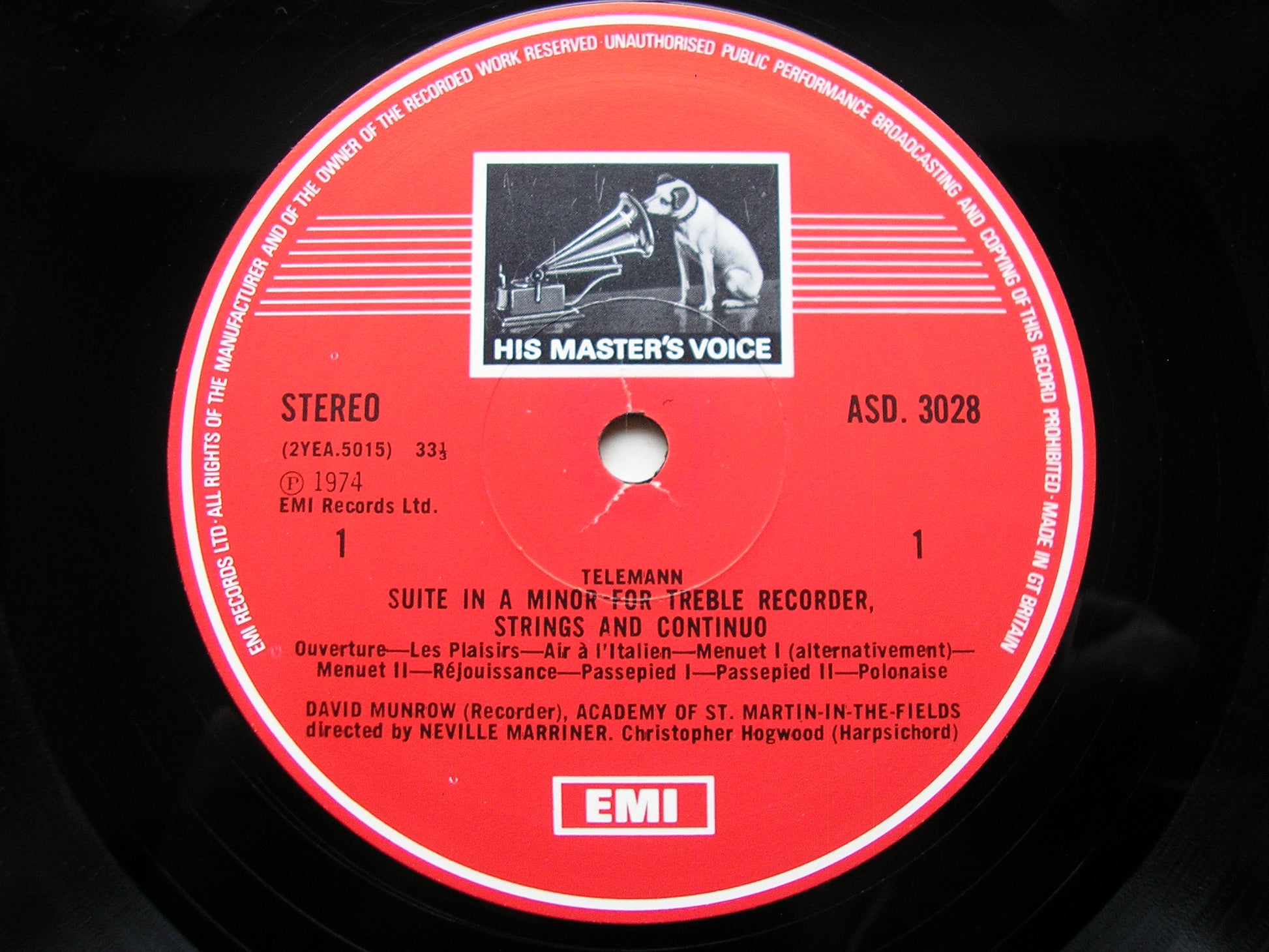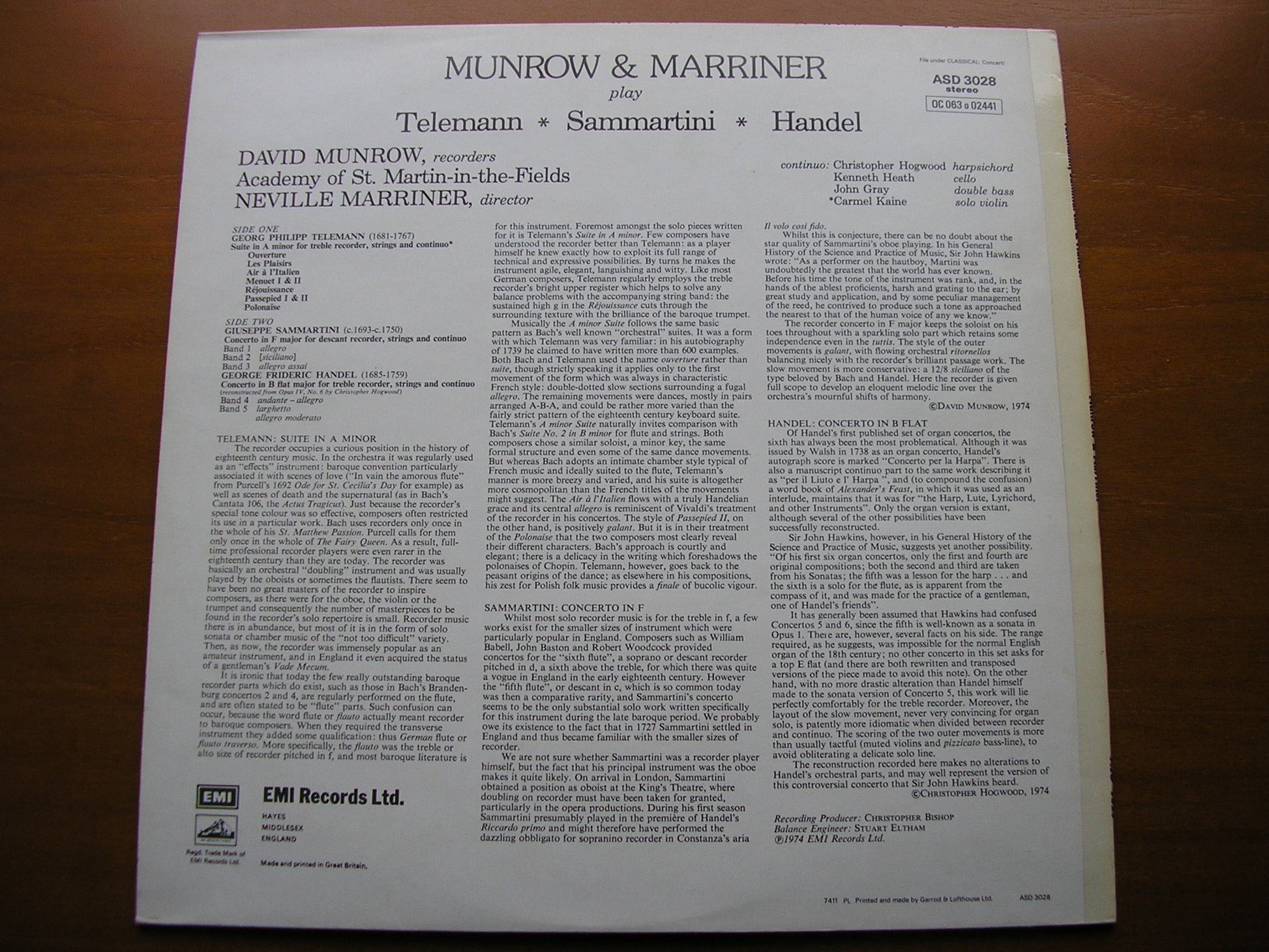 ASD 3028  TELEMANN: SUITE in A / SAMMARTINI: CONCERTO in F / HANDEL: CONCERTO in B      DAVID MUNROW / ACADEMY OF ST MARTIN IN THE FIELDS / NEVILLE MARRINER