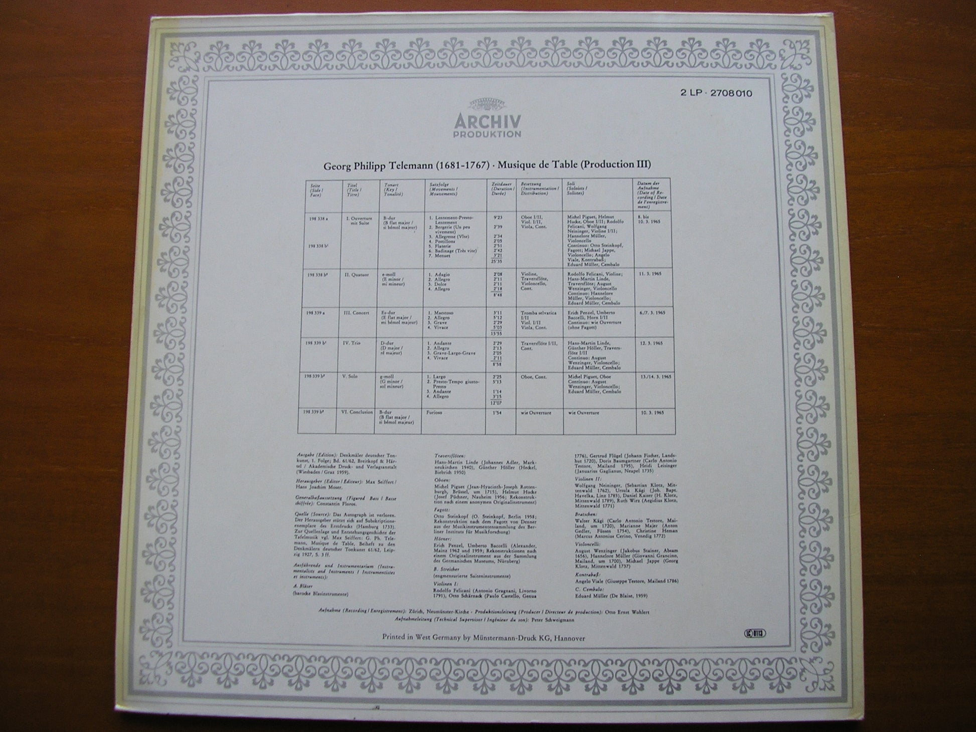 TELEMANN: TAFELMUSIK Production 3 WENZINGER / SCHOLA CANTORUM BASILIENSIS 2LP 2708 010