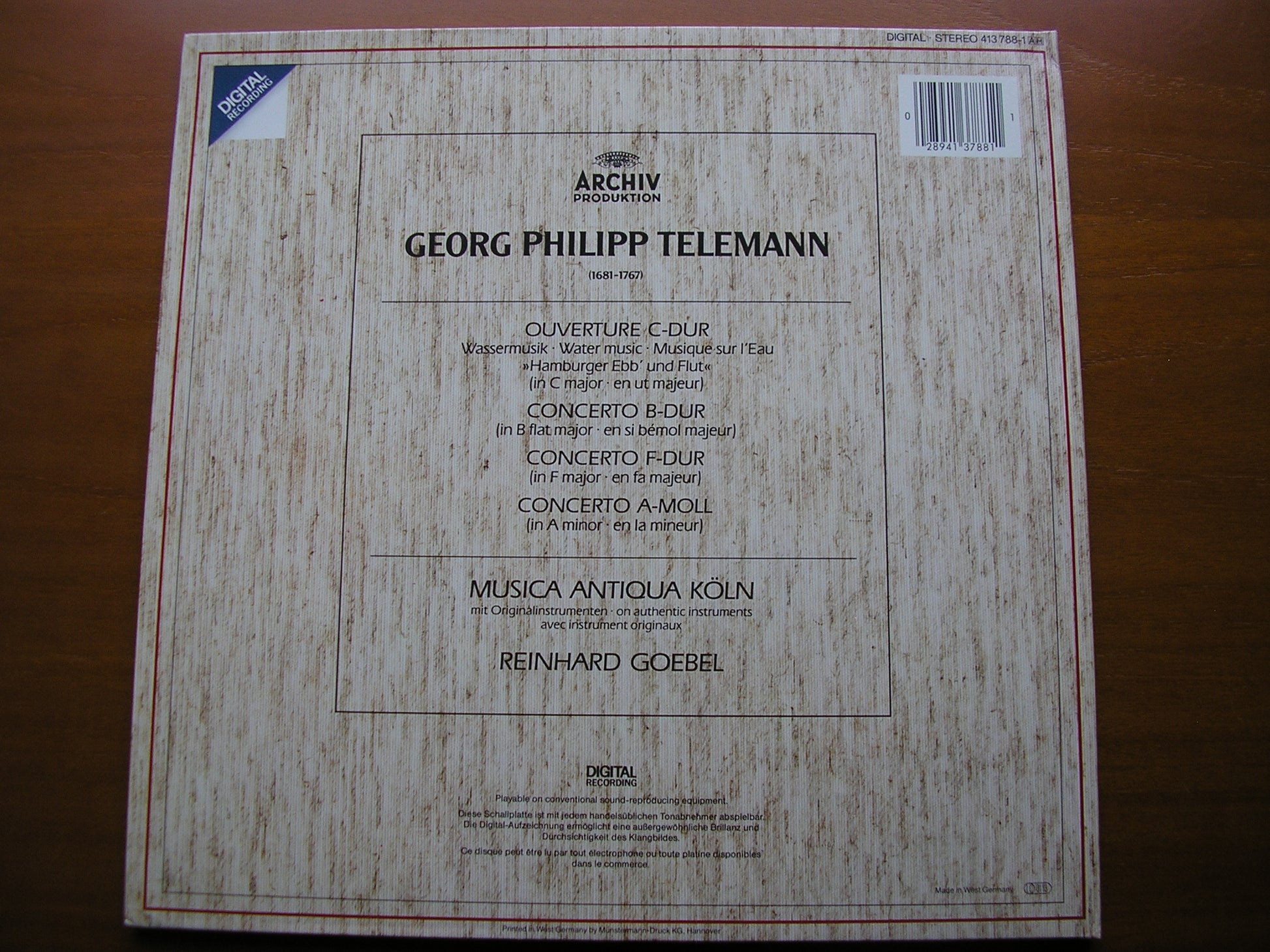413 788  TELEMANN: WATER MUSIC / THREE CONCERTOS     MUSICA ANTIQUA COLOGNE / REINHARD GOEBEL