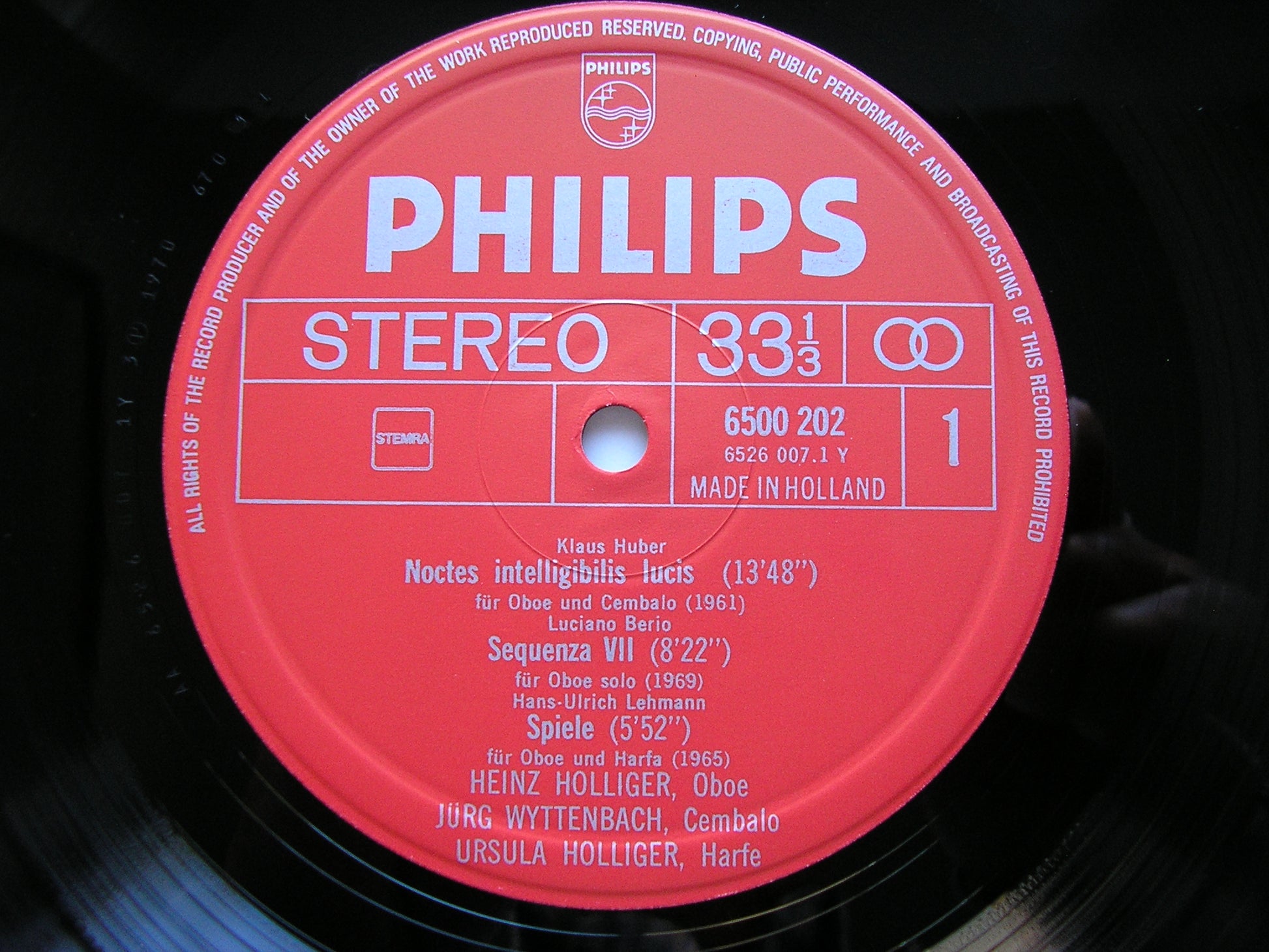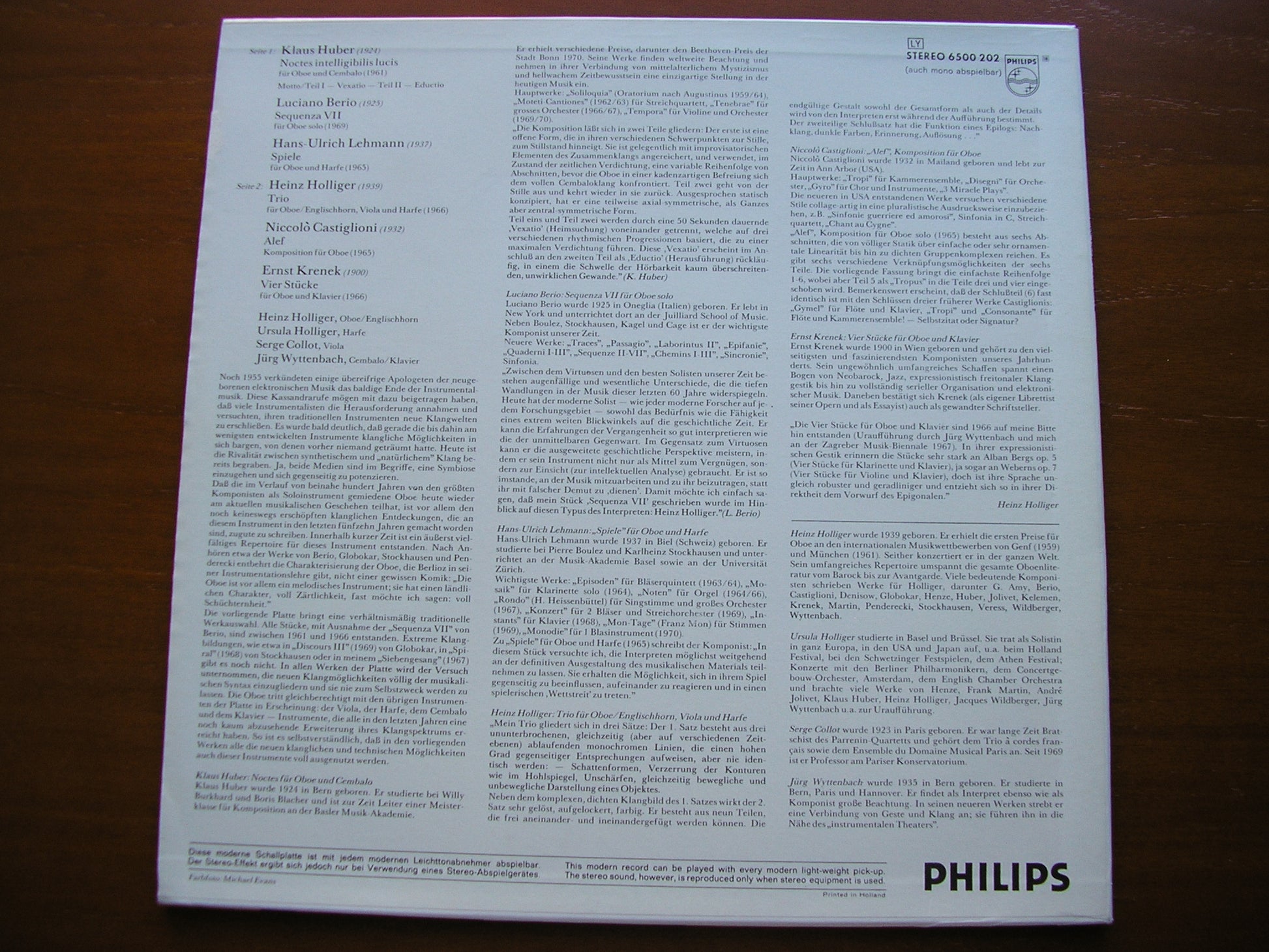 6500 202  LEHMANN Spiele / HOLLIGER Trio / HUBER Noctes intelligibilis lucis / CASTIGLIONE Alef /  KRENEK Vier Stucke / BERIO Sequenza VII    HEINZ HOLLIGER, flute / URSULA HOLLIGER, harp / SERGE COLLOT, viola / JURG WYTTENBACH, piano