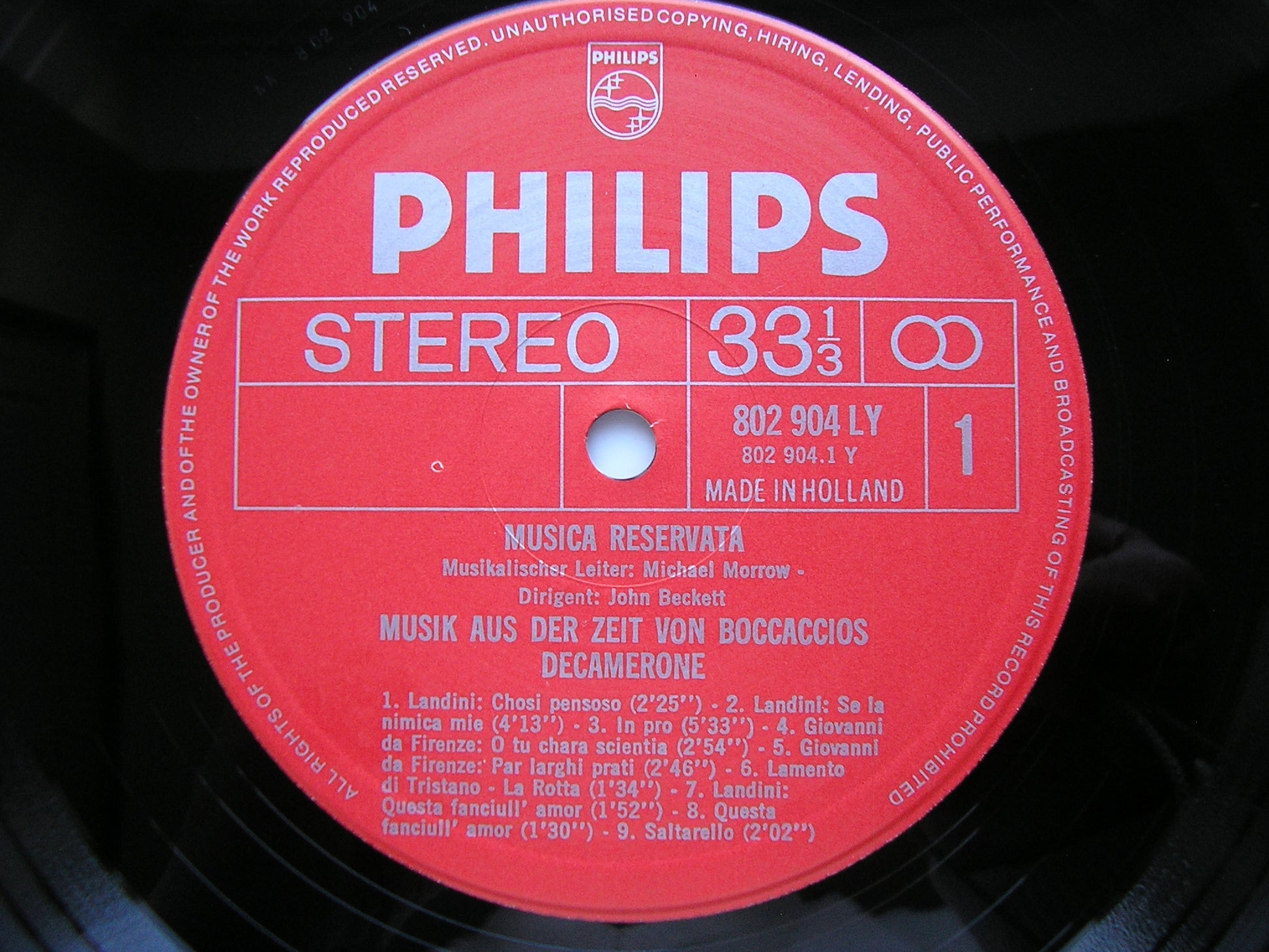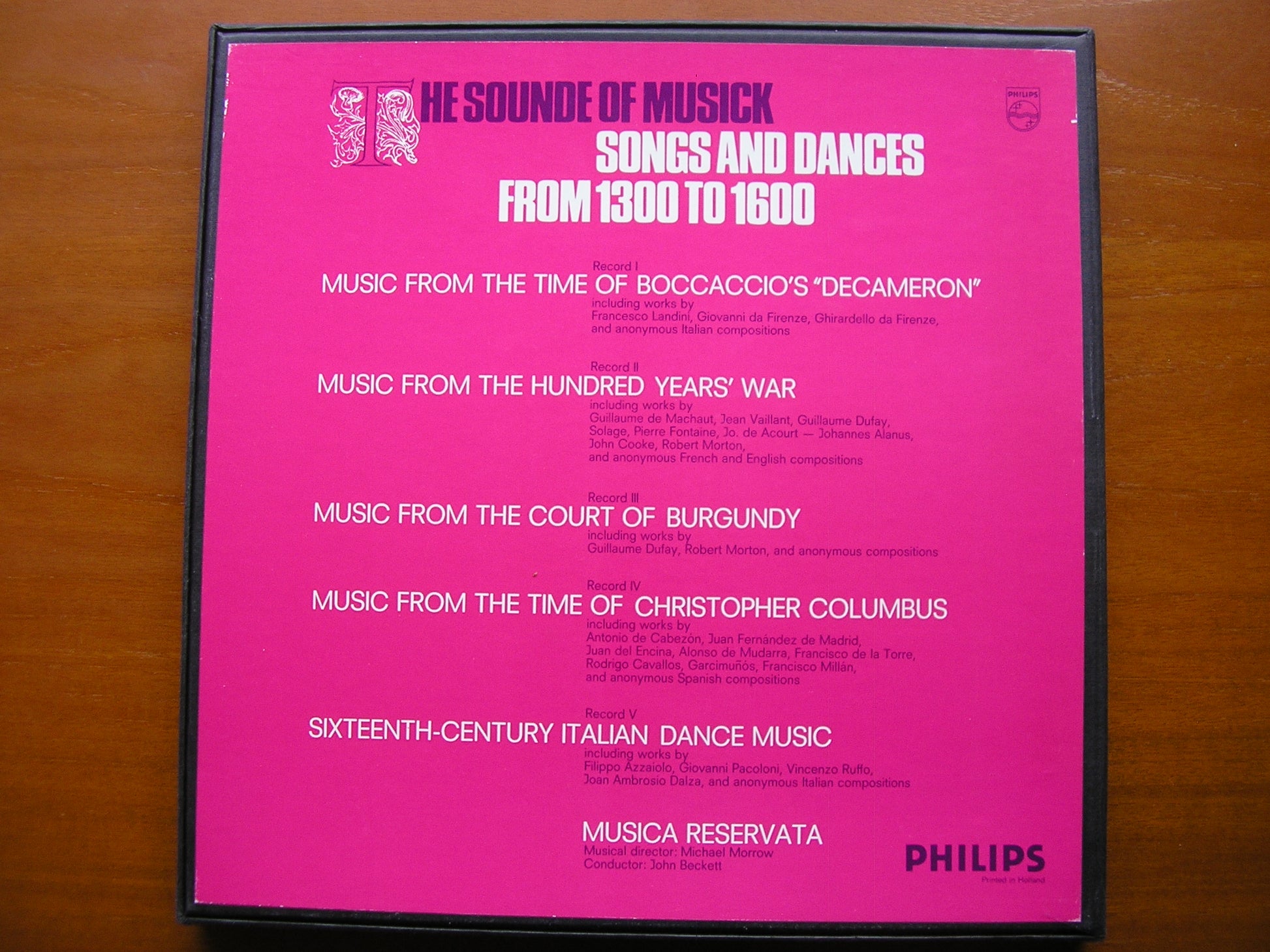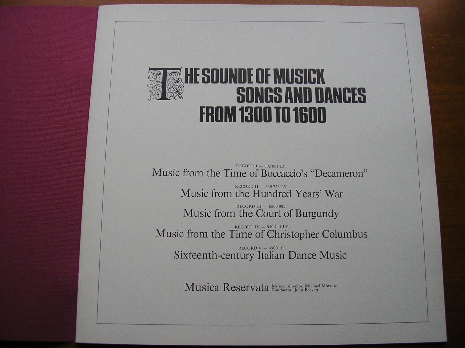 6747 004  THE SOUNDE OF MUSICK: LANDINI / GIOVANNI DI FIRENZE / GHIRARDELLO DI FIRENZE / DE MACHAUT / DUFAY / VAILLANT / SOLAGE / FONTAINE / COOKE / MORTON / CABEZON / FERNANDEZ / JUAN DEL ENCINA / ALONSO DE MUDURRA / CAVALLOS / MILLAN / PACOLINI / RUFFO / DALZA / AZZAIOLA      JOHN BECKETT / MUSICA RESERVATA