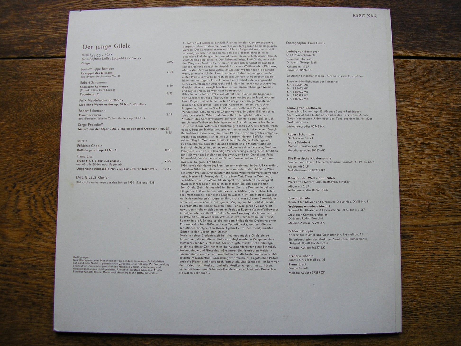 THE YOUNG GILELS: MENDELSSOHN / LULLY / RAMEAU / PROKOFIEV / LISZT / CHOPIN EMIL GILELS 85 312 XAK