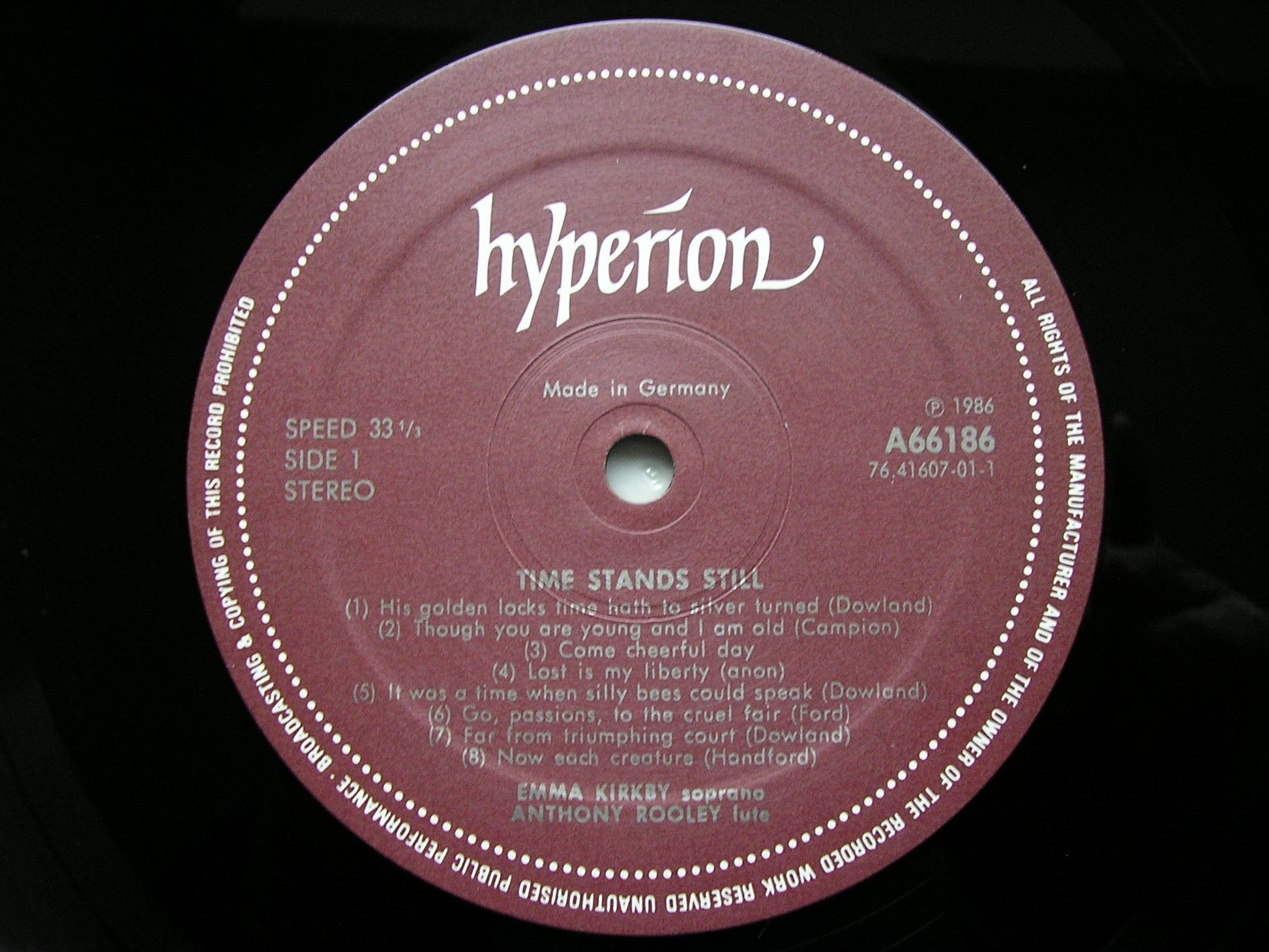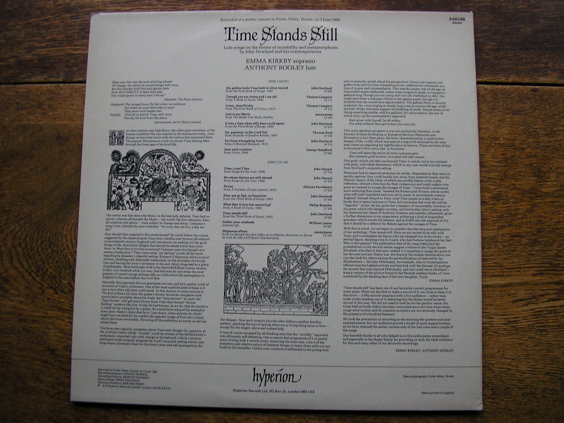 A66186  TIME STANDS STILL:  LUTE SONGS BY DOWLAND / CAMPION / FORD / DANYEL / LAWES / ROSSETER / FERRABOSCO / HANDFORD     EMMA KIRKBY / ANTHONY ROOLEY