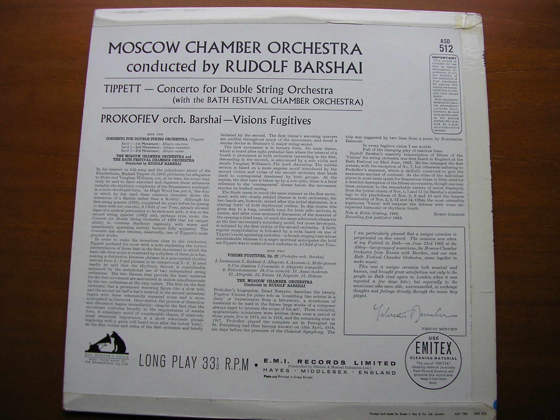 ASD 512  TIPPETT: CONCERTO FOR DOUBLE STRING ORCHESTRA /PROKOFIEV: VISIONS FUGITIVES     RUDOLF BARSHAI / MOSCOW CHAMBER ORCHESTRA / BATH FESTIVAL ORCHESTRA