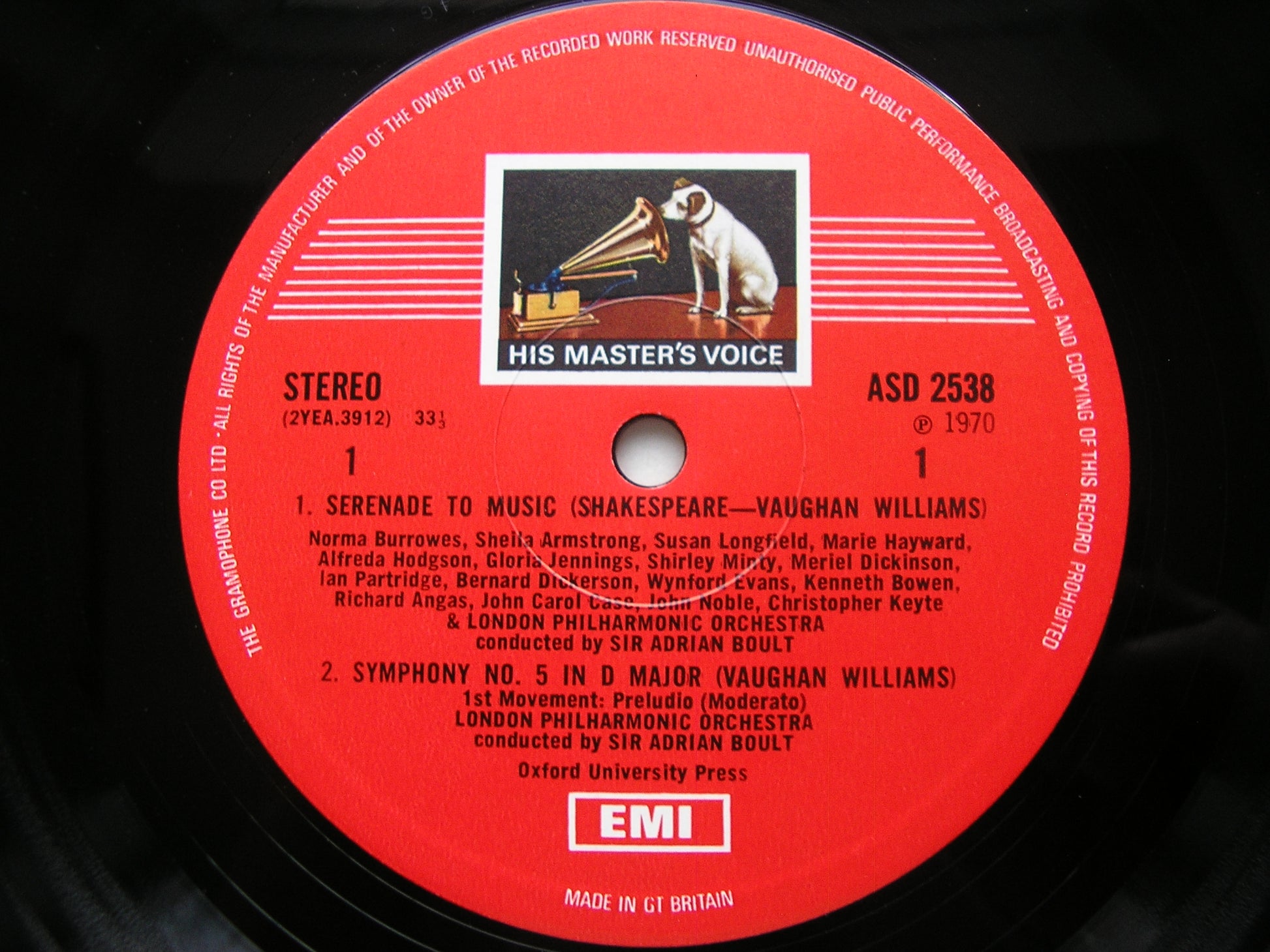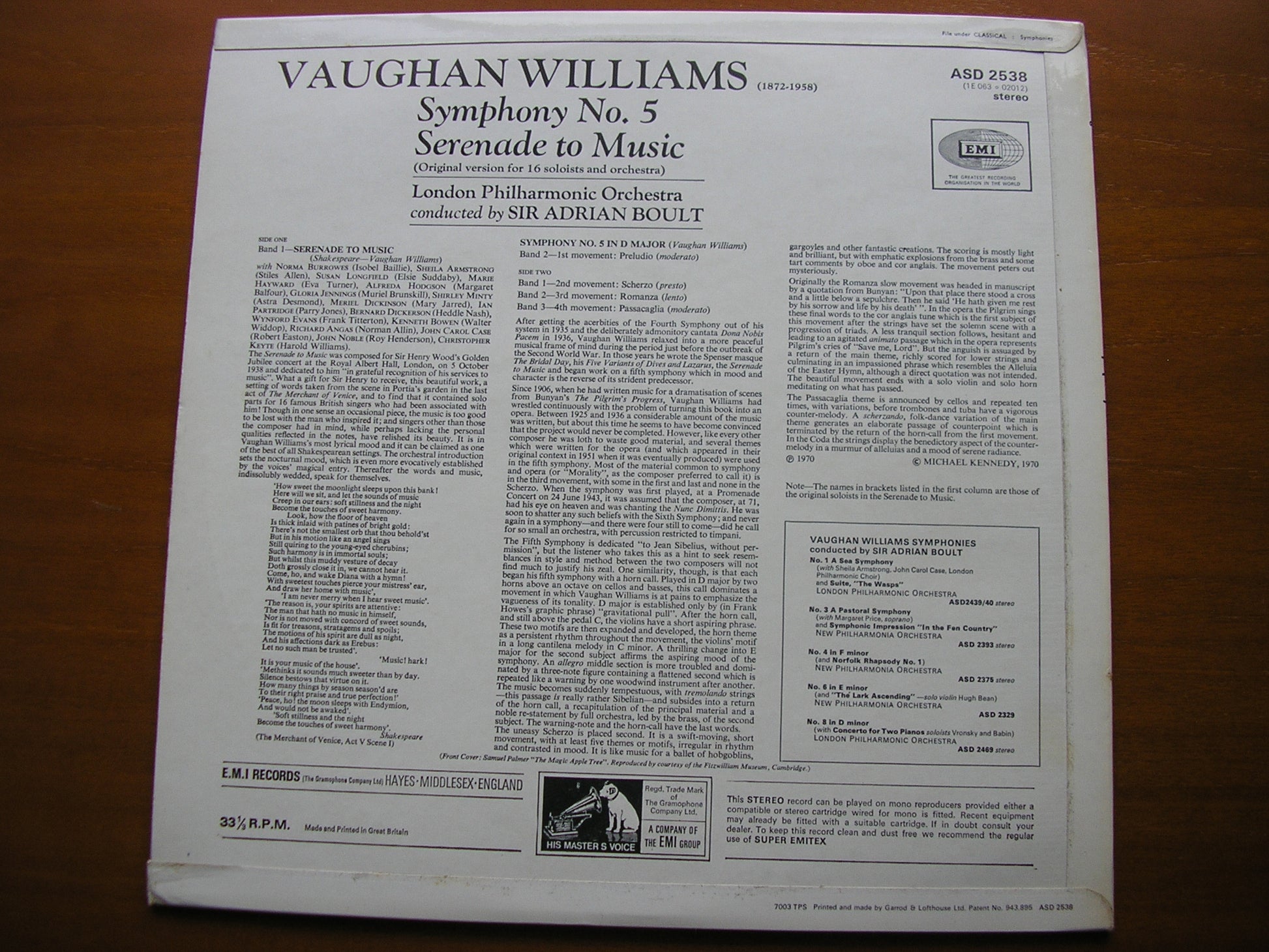 ASD 2538  VAUGHAN WILLIAMS: SYMPHONY No. 5 / SERENADE TO MUSIC     SOLOISTS / LONDON PHILHARMONIC ORCHESTRA / SIR ADRIAN BOULT