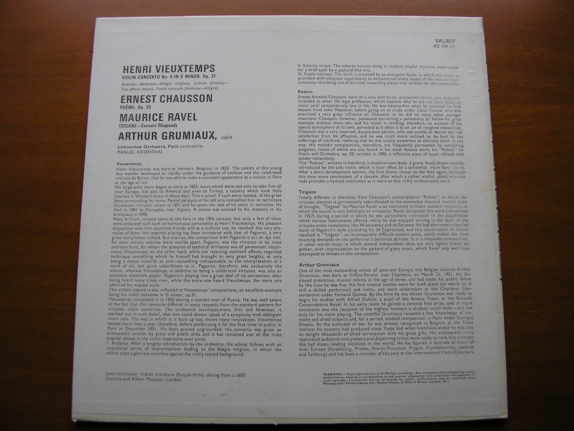SAL 3587  VIEUXTEMPS: VIOLIN CONCERTO No. 4 / CHAUSSON: POEME Op. 25 / RAVEL: TZIGANE       ARTHUR GRUMIAUX / LAMOUREUX ORCHESTRA / MANUEL ROSENTHAL
