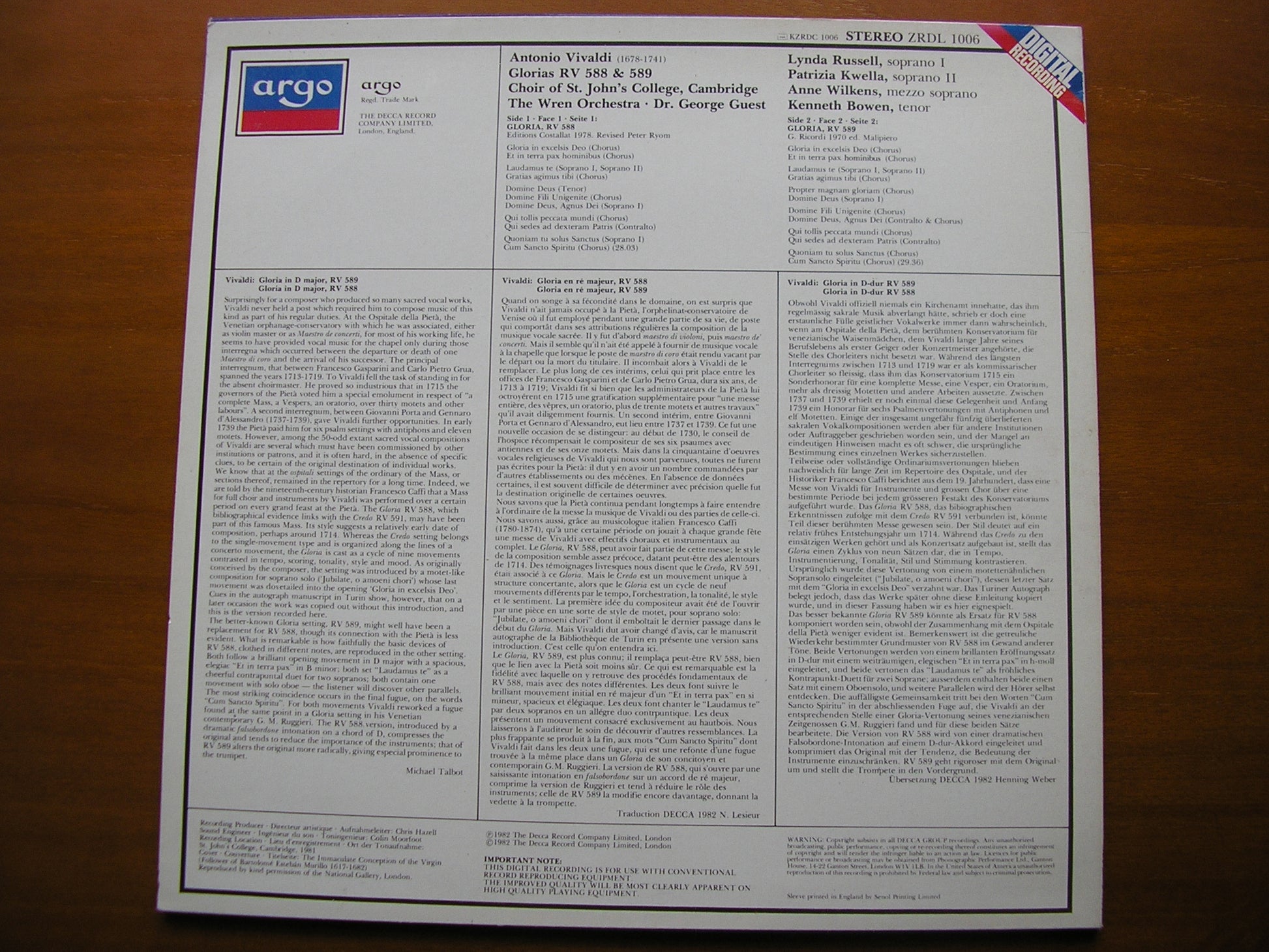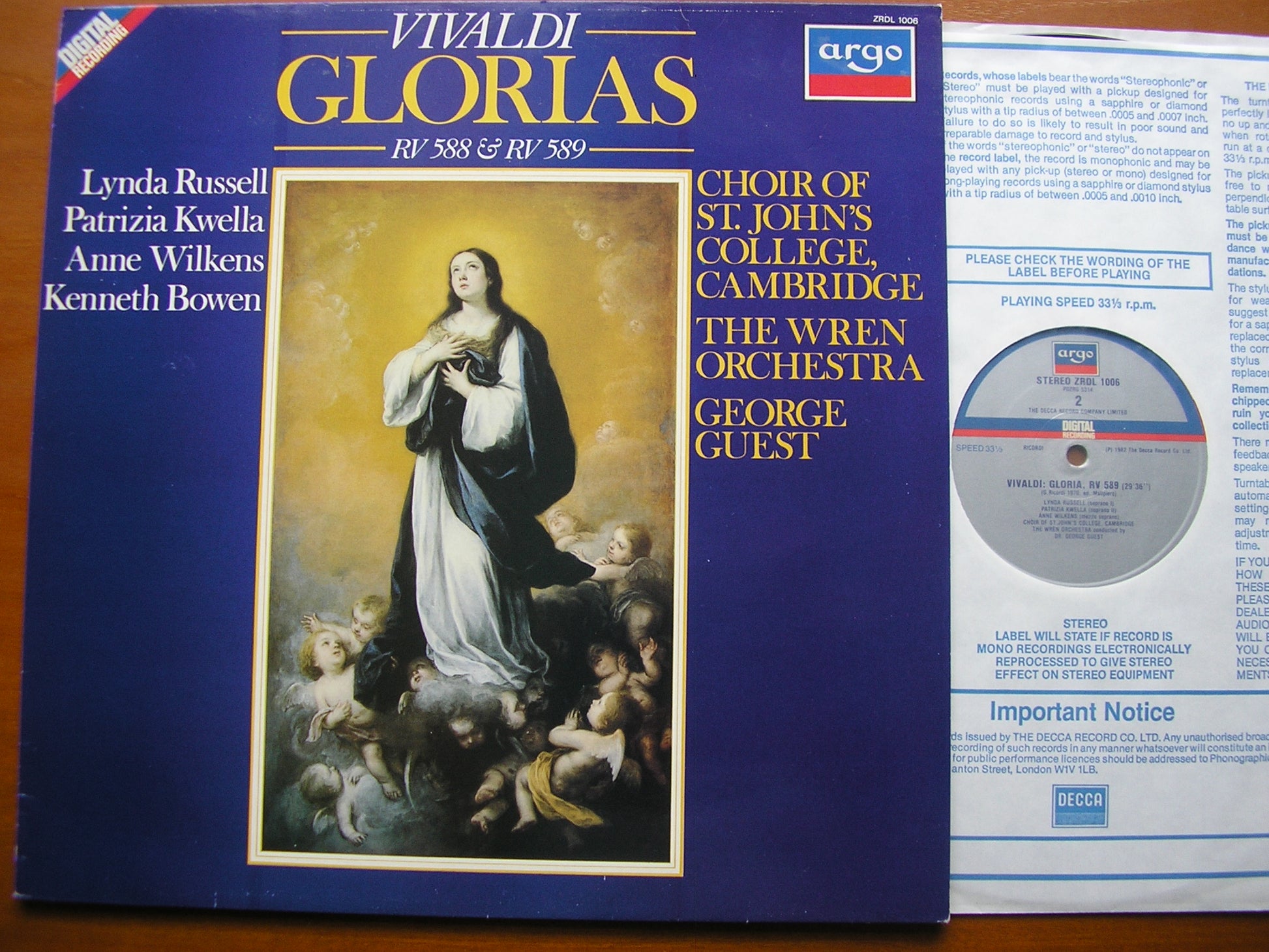 ZRDL 1006  VIVALDI: GLORIAS  RV 588 & RV 589      SOLOISTS / THE WREN ORCHESTRA / CHOIR OF ST JOHN'S COLLEGE CAMBRIDGE / GEORGE GUEST