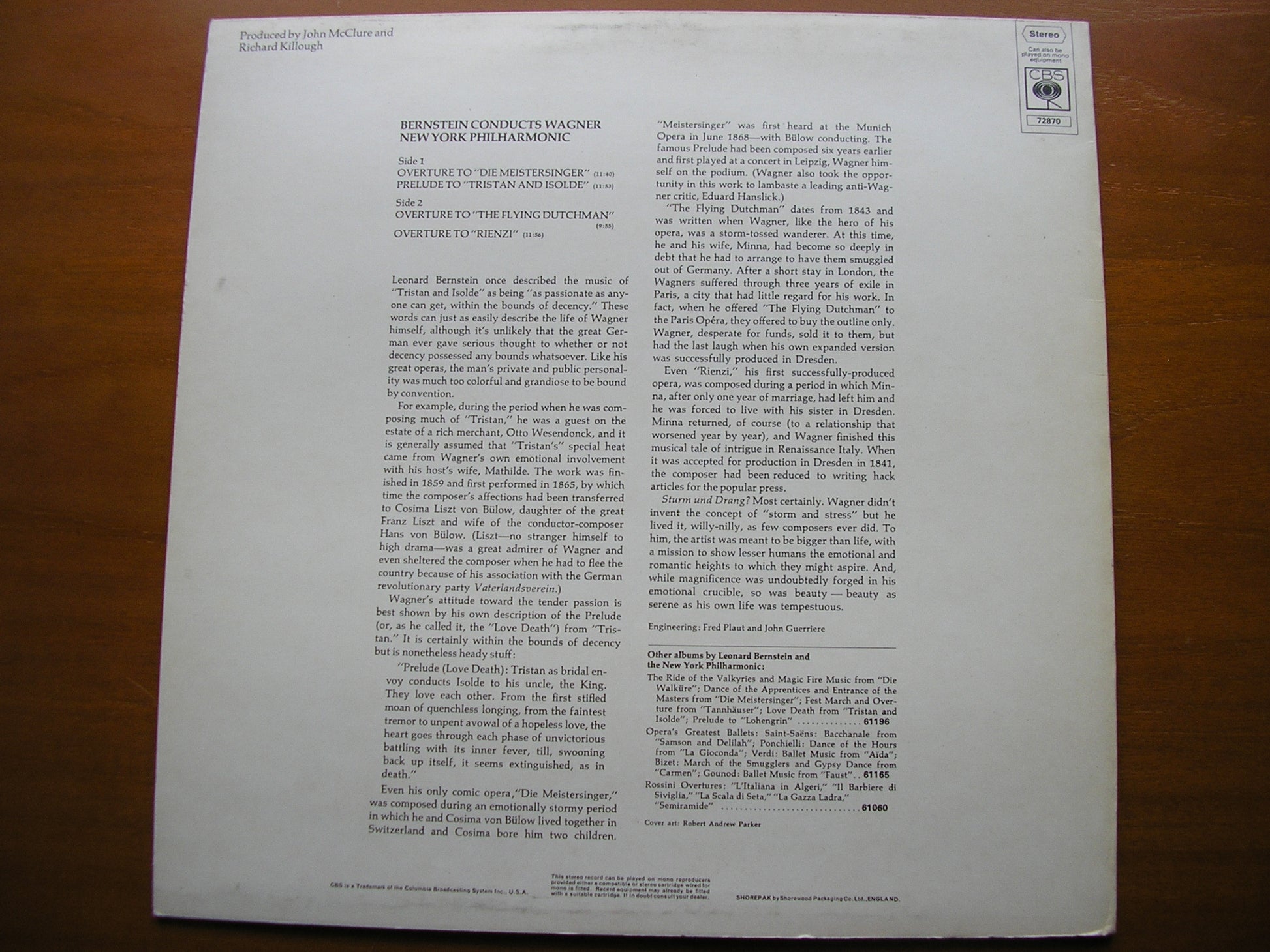 72870  WAGNER: TRISTAN Prelude / OVERTURES Rienzi / The Flying Dutchman / Mastersingers        LEONARD BERNSTEIN / NEW YORK PHILHARMONIC ORCHESTRA