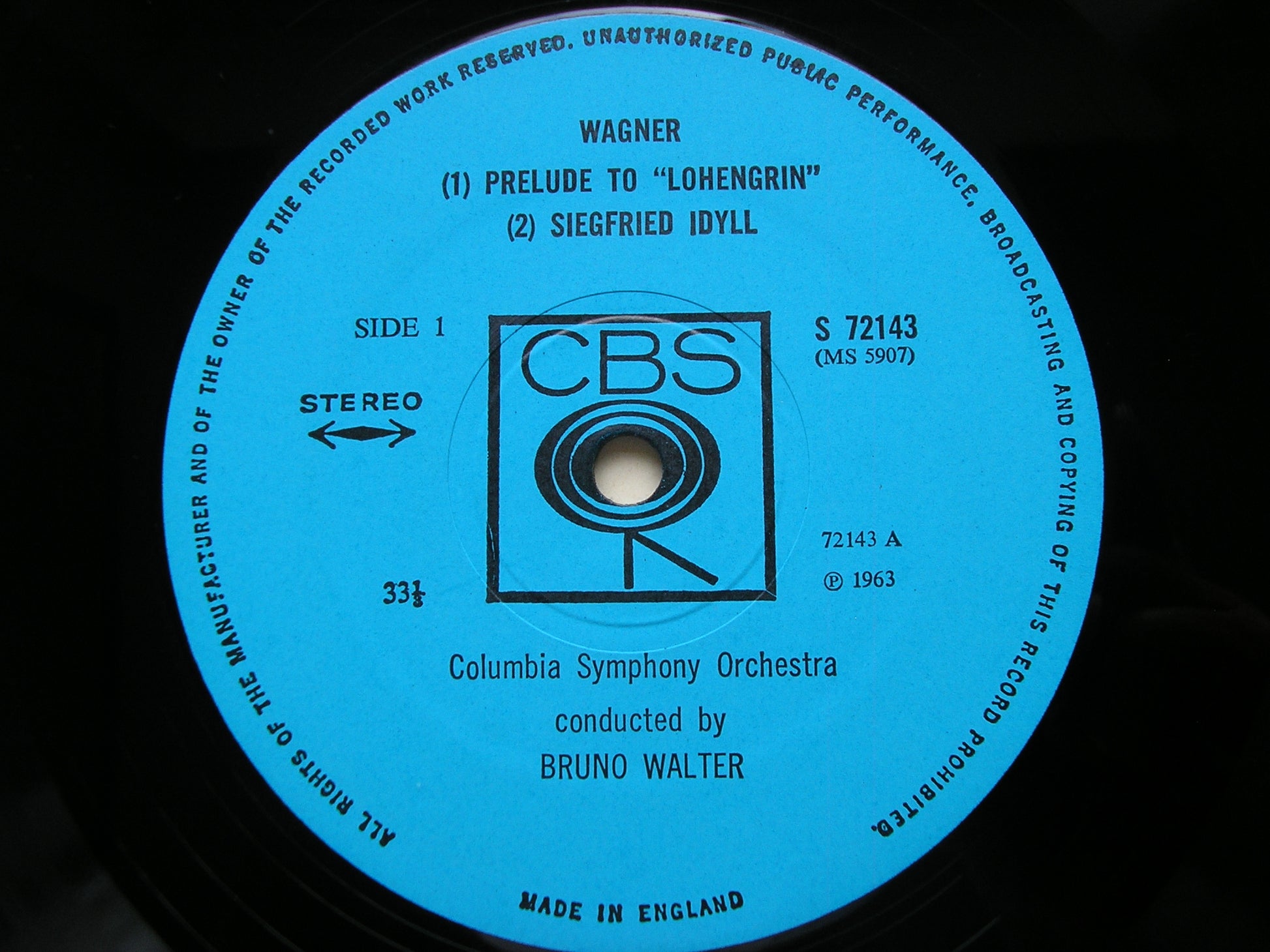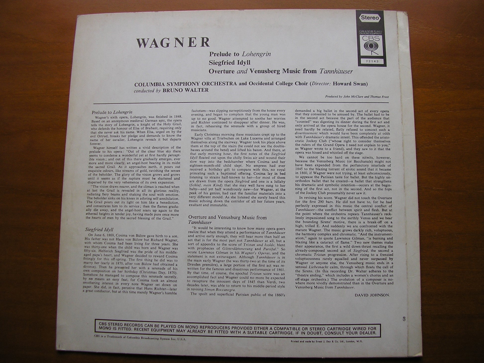 72143  WAGNER: LOHENGRIN Prelude / TANNHAUSER Overture & Venusberg Music / SIEGRIED IDYLL        BRUNO WALTER / COLUMBIA SYMPHONY ORCHESTRA