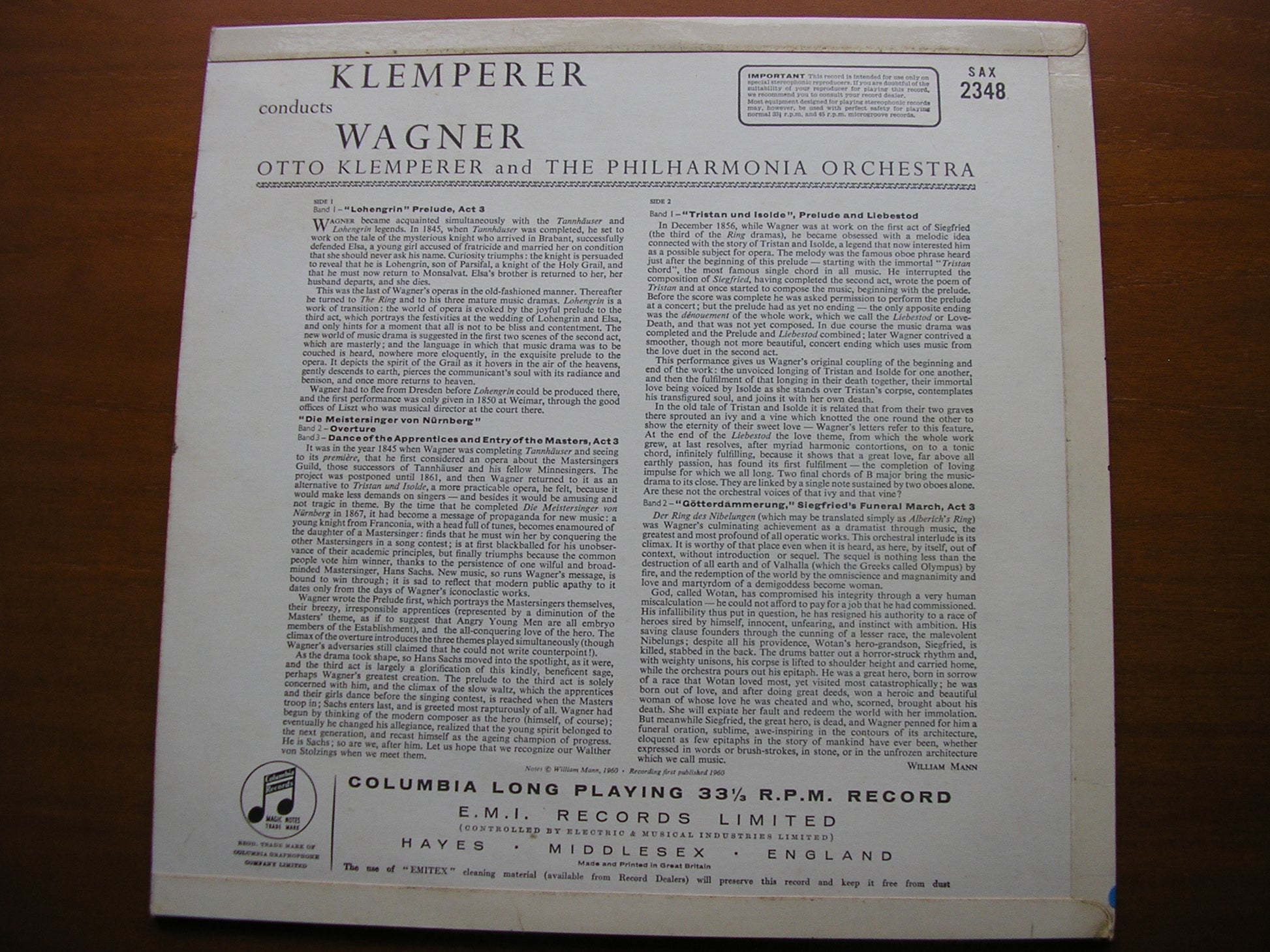 SAX 2348  WAGNER: TRISTAN Prelude & Liebestod / GOTTERDAMMERUNG Siegfried's Funeral Music / THE MASTERSINGERS Overture & Dance of the Apprentices     OTTO KLEMPERER / PHILHARMONIA ORCHESTRA