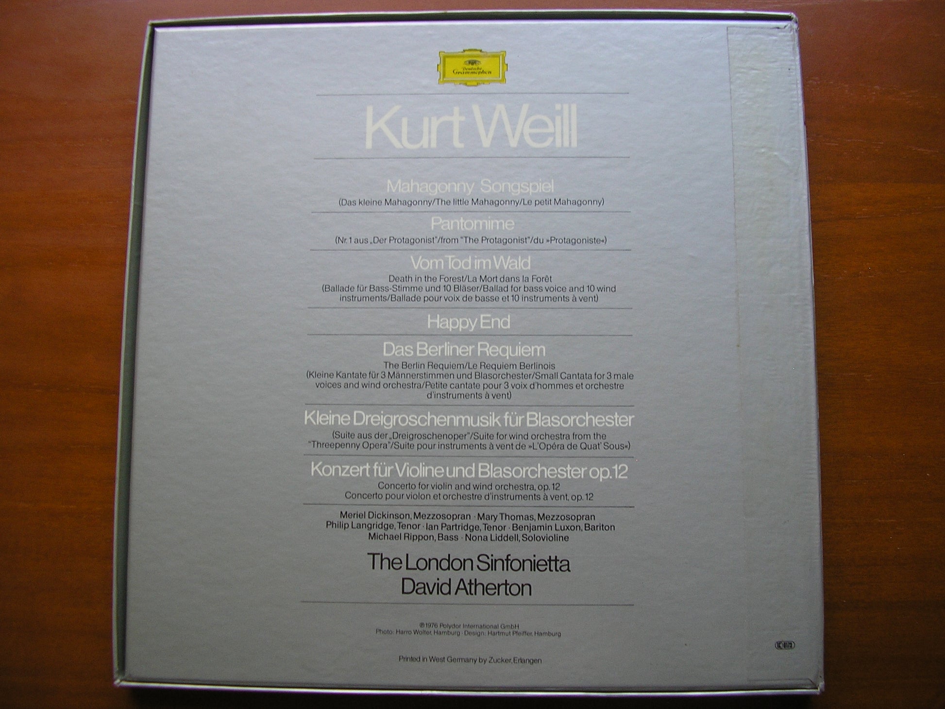 2740 153  KURT WEILL: VIOLIN CONCERTO / MAHAGONNY SONGSPIEL / HAPPY END / BERLIN REQUIEM / PANTOMIME / THE THREEPENNY OPERA Suite / DEATH IN THE FOREST  DAVID ATHERTON / SOLOISTS / THE LONDON SINFONIETTA