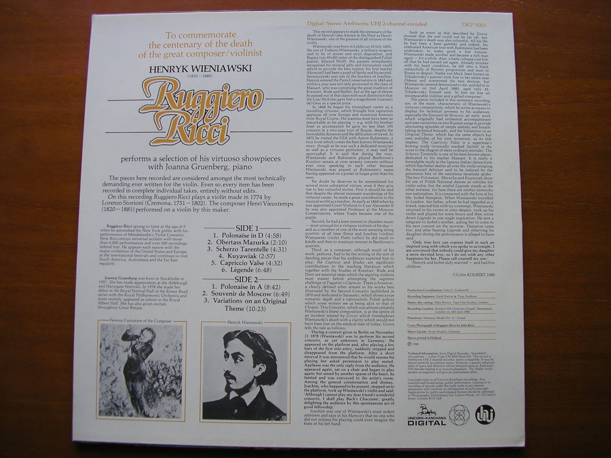 DKP 9003  WIENIAWSKI: VIRTUOSO SHOWPIECES     RUGGIERO RICCI / JOANNA GRUENBERG