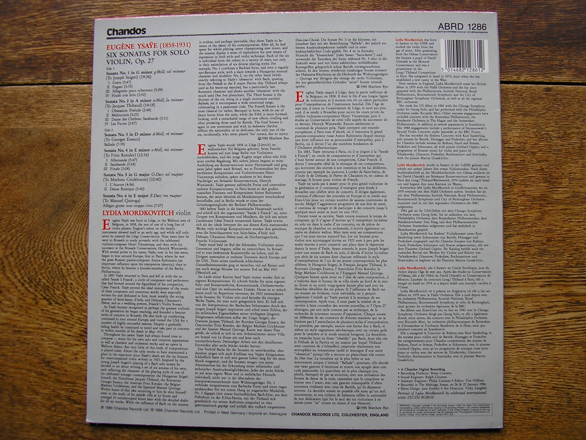 ABRD 1286  YSAYE: SIX SONATAS FOR SOLO VIOLIN Op. 27  LYDIA MORDKOVITCH